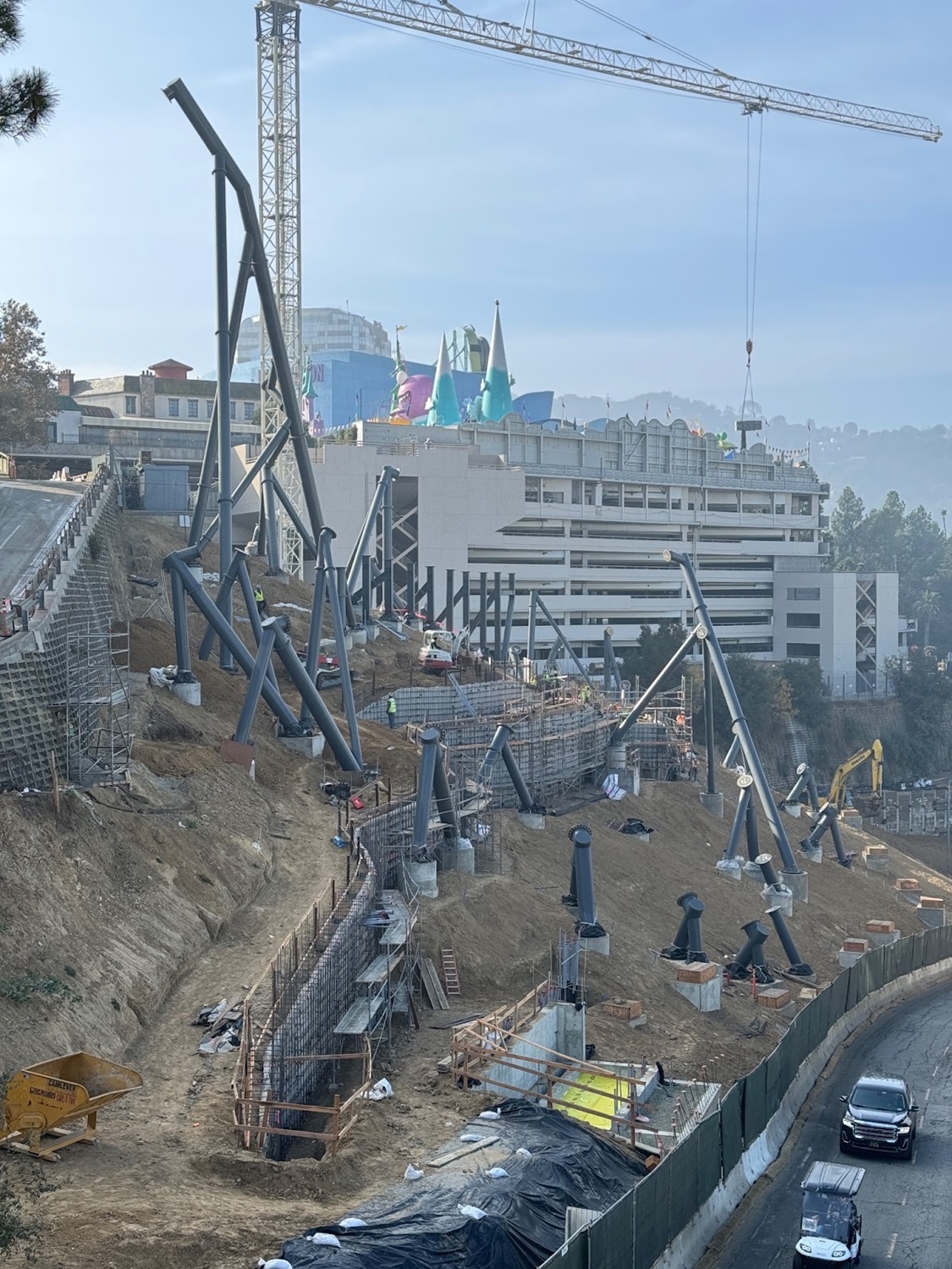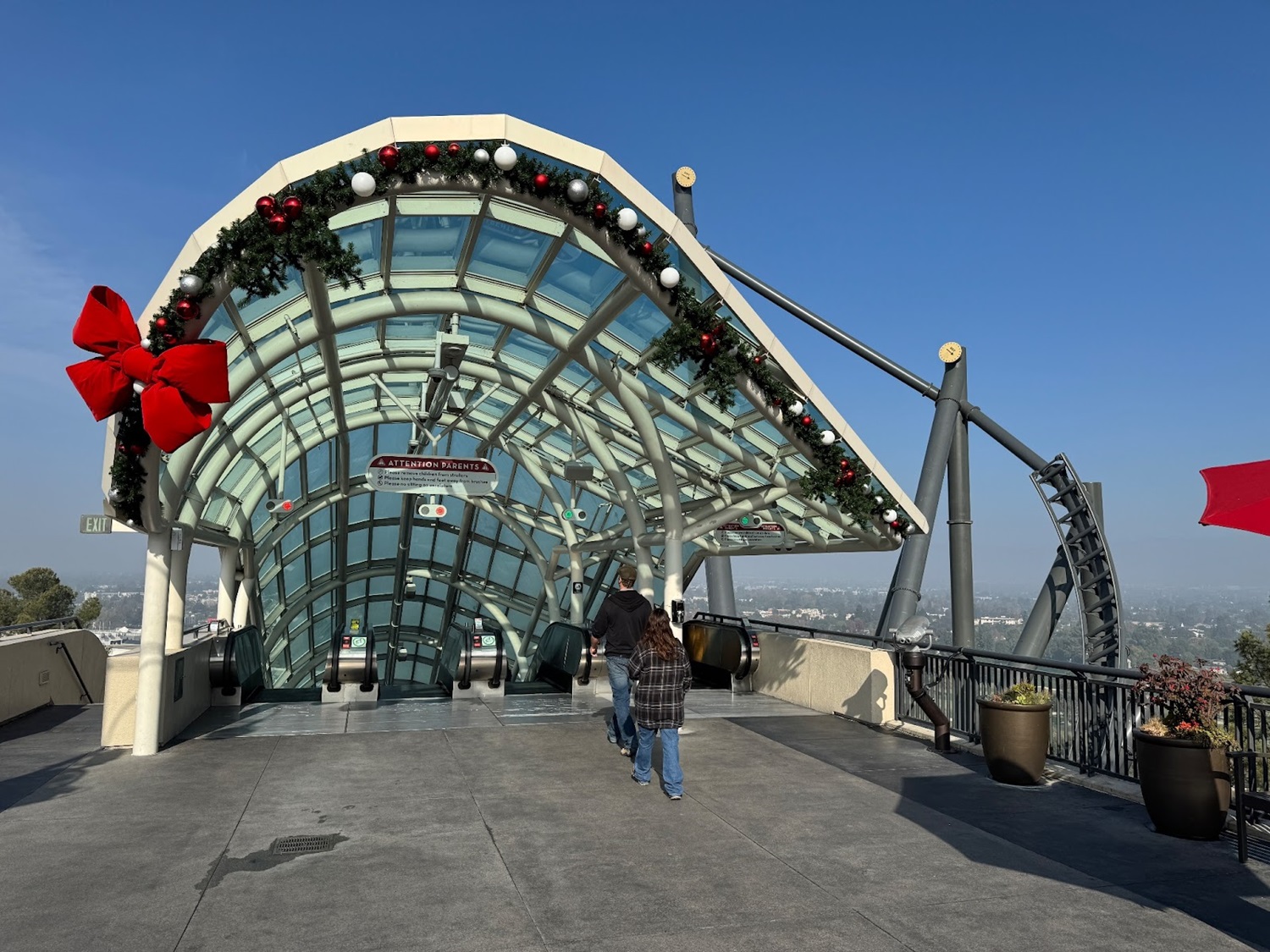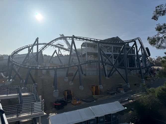 Moving on to the escalator to the Lower Lot, track for the new coaster is instantly visible – going under and over the escalators, with a large section off to the left-hand side on the hillside.