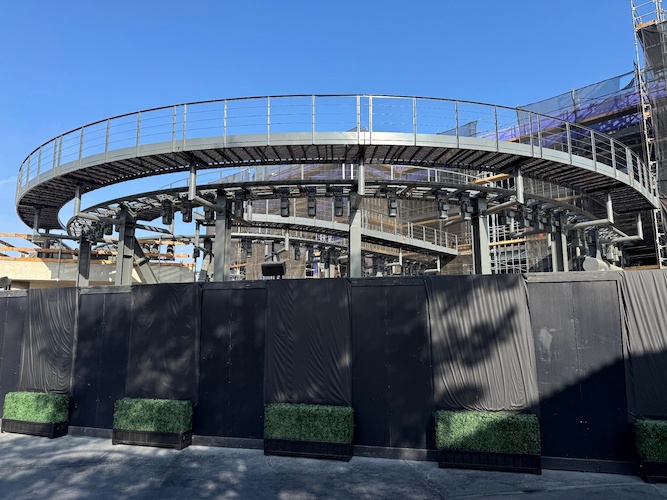New track has been installed all around the park’s iconic escalators as the coaster chugs along to its 2026 opening.