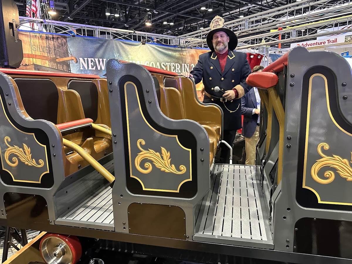 At this weekend’s annual IAAPA convention, Silver Dollar City and Rocky Mountain Construction unveiled the new vehicle for their Fire In The Hole family coaster.