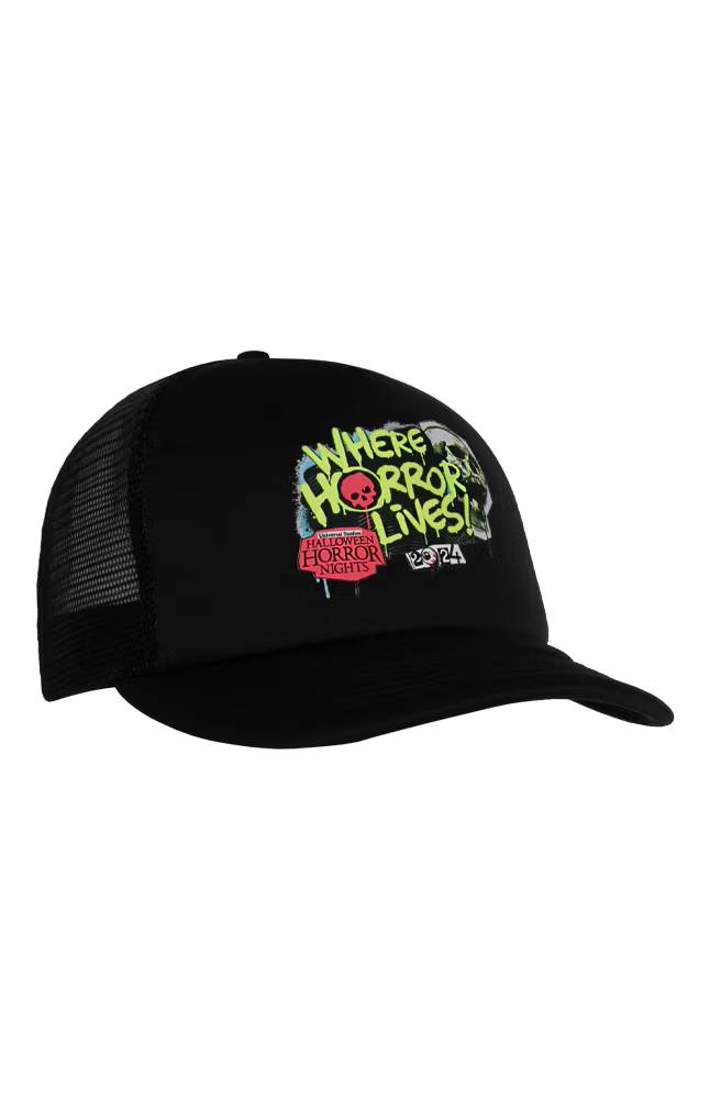 - Get ready for Halloween Horror Nights 2024 with this Official HHN baseball cap in the color black featuring a screaming skull with "Horror Lives Here" across the top in a graffiti art style.