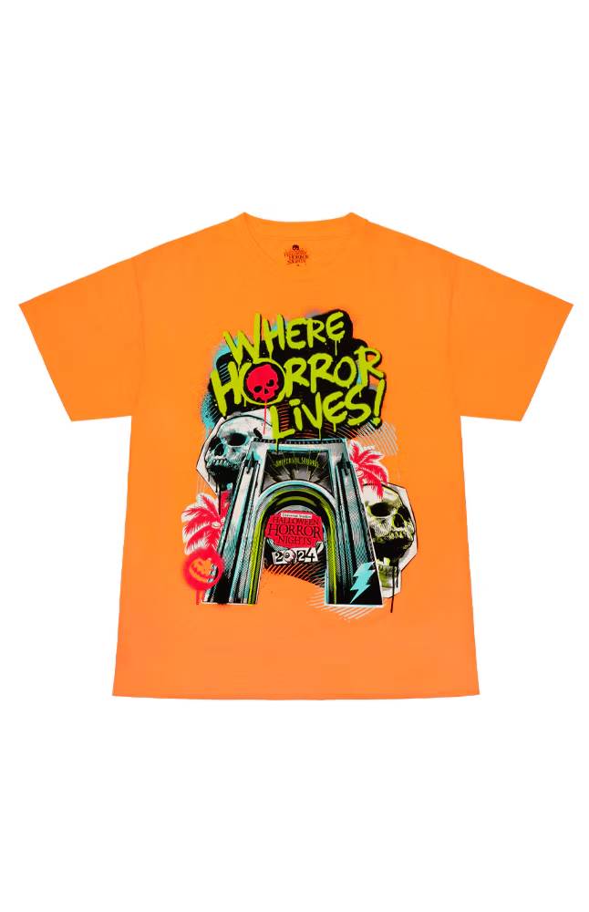 - Get ready for Halloween Horror Nights 2024 with this Official HHN t-shirt in the color orange featuring the iconic Universal archway surrounded by screaming skulls with "Horror Lives Here" across the top in a graffiti art style.