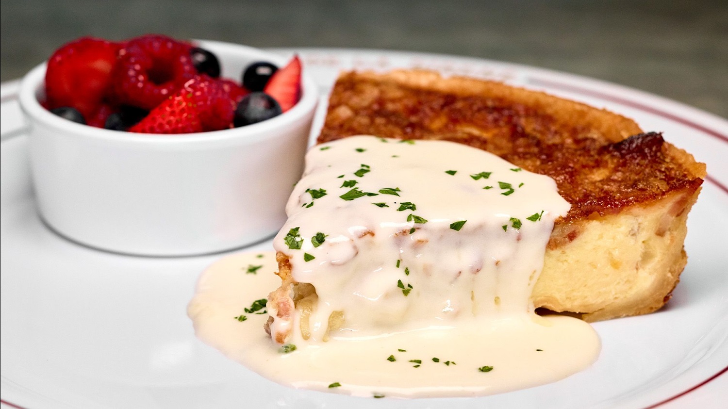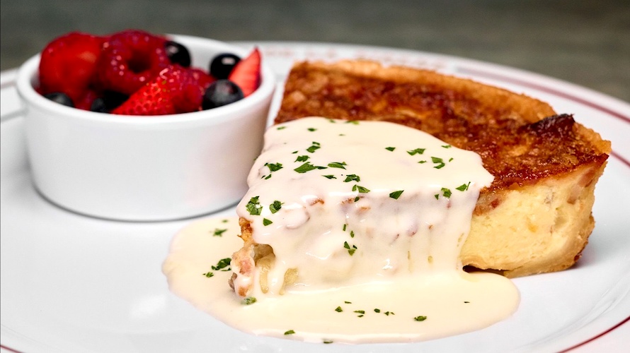 - Quiche Lorraine (Café L’air De La Sirène) – a savory dish featuring egg custard baked in a flaky pie crust filled with crispy bacon, gruyère cheese and caramelized onions with mornay sauce, and a side of fresh berries topped with a lavender honey drizzle