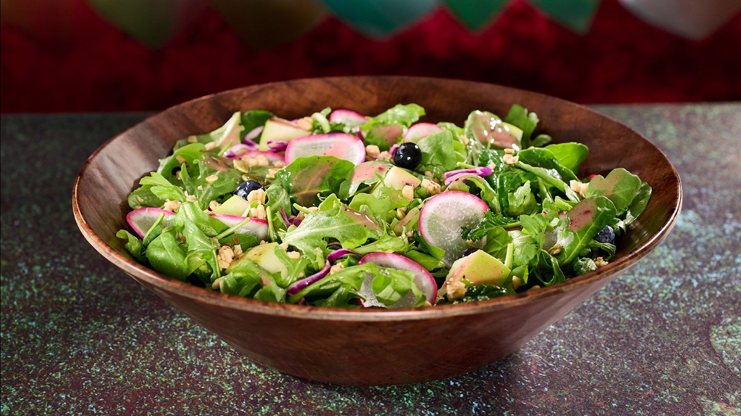 - Nordic Harvest Salad (VG) (Mead Hall) – this salad features kale and arugula greens, crisp red cabbage, radishes and hearty ancient grains, with blueberries and crisp apples for a tangy flavor, a sprinkle of trail mix that adds a satisfying crunch and raspberry vinaigrette to top it all off