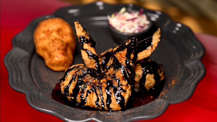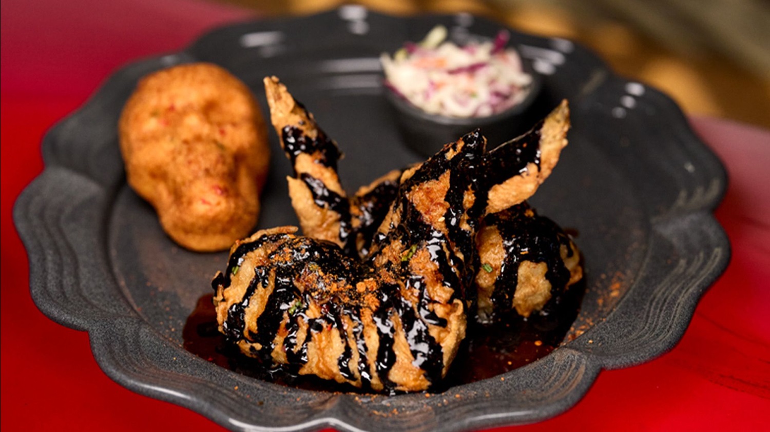 - “Blood" Orange Chicken Sandwich (Das Stakehaus) – flash-fried marinated chicken breast tossed in a tantalizing blood orange sauce served in a sinister black bun with tangy pickles, a slaw and crispy fries