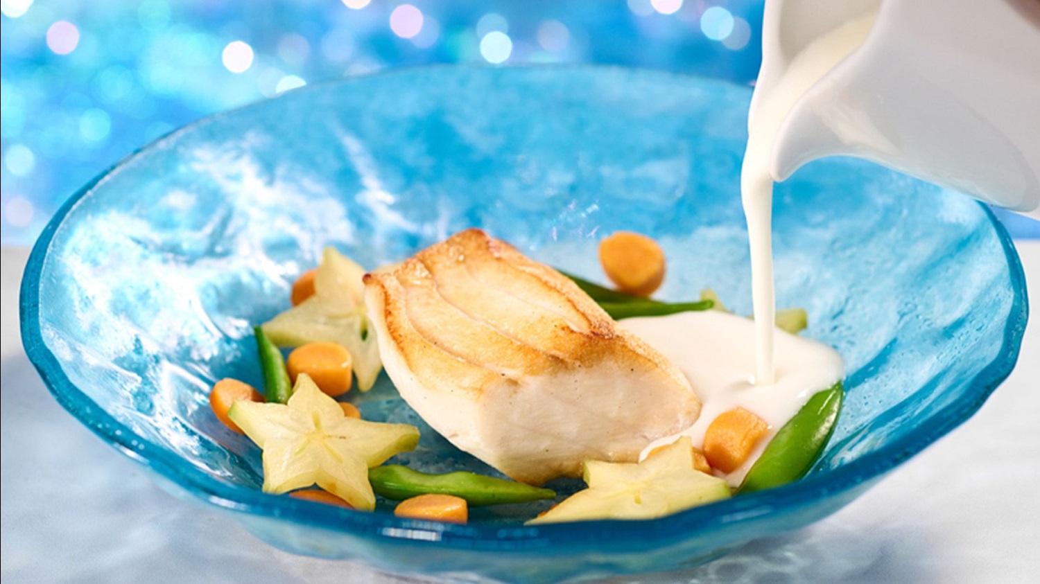 - Sea Bass (Atlantic) – a delectable portion of Sea Bass nestled amid the subtle sweetness of carrot mochi and vibrant crunch of fresh sugar snap peas. Aromatic lemongrass broth complements the buttery bass, while star fruit slices add a splash of tropical citrus notes