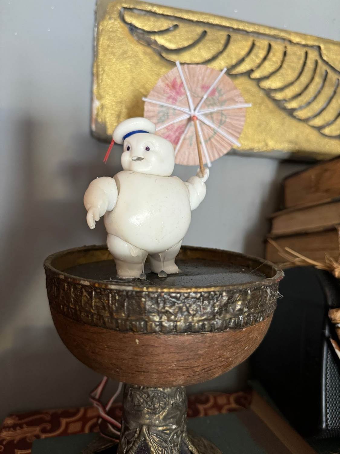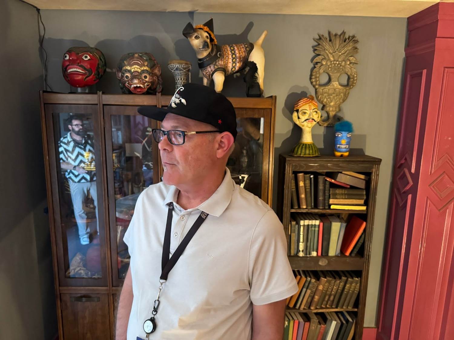 “Obviously this house is based on Ghostbusters: Frozen Empire," John Murdy began, “but it has callbacks to a lot of the other films in the franchise as we're going [along], so you kind of get the best of both worlds. Last time we did [a ‘Ghostbusters’ haunted house, the firehouse was the facade. This time we decided to do Ray’s Occult bookstore, so that's what we're standing out in front of. There's a whole pre-show that happens while you're waiting in line. The Taxi Driver Ghost animated figure is going to be inside the taxi cab and then you can Slimer inside [the hot dog cart]-- every once in a while he pops up and he's got the hot dogs in his mouth. You're hearing Ray, Dan Aykroyd's character, talk about the Death Chill and set up the story, and then we go inside Ray's. And what's crazy is there's stuff in here that's from Mummy movies. There's stuff in here from all kinds of different movies– stuff we've acquired over the years. The Mini-Pufts are all animated; it was just a little science project because they were really small, so we got the 3D model for them."