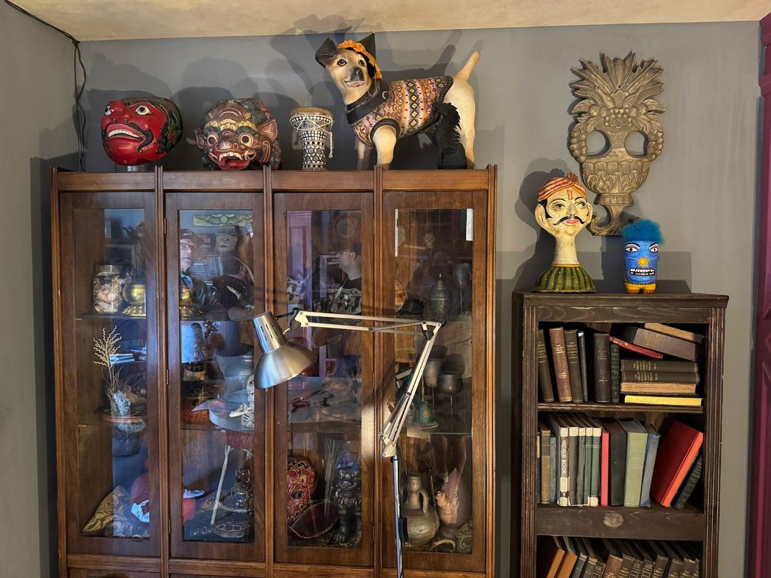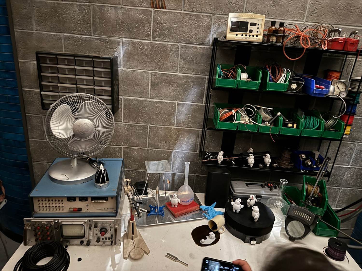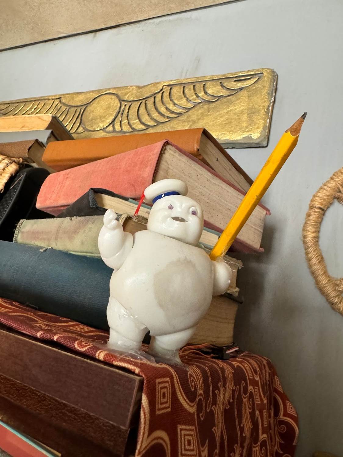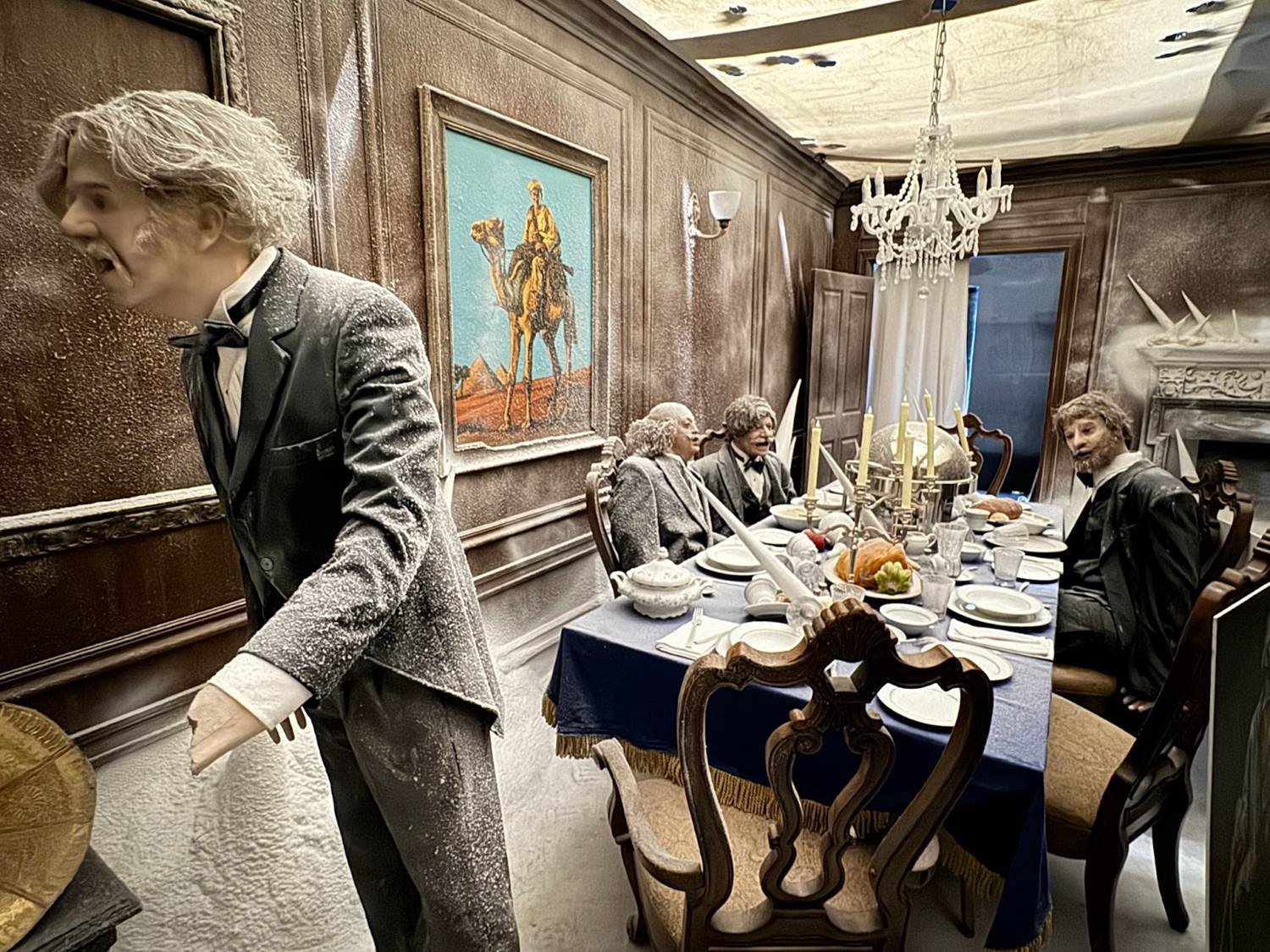 “And then we designed them so that there's five tiny little servo motors inside there– the kind of stuff you'd use for high-end model train stuff. The guy with the parasol pops up out of that cup, the one inside the book– his legs are kicking, there's the guy there sticking his hand inside the pencil sharpener, and that's all animated. So [there are] lots of lots [of them], and then the ones on the lamp, too, turning it on and off. Lots of animated figures. In this scene we have Ray Stantz, and he's behind the counter. He's on the phone talking to the New York librarian about the Death Chill, and Podcast’s his partner in the new movies– [he] comes around the corner with the Hammer of Truth. He's gonna smash the Mini-Pufts, but you're in his path… so he's the scare. And then we're making this whole wall disappear and you see Nadeem’s secret room from the new movie, which has all that armor there. And then from there, we have to take you back 100 years. There's a line in the movie where the librarian says this happened 100 years ago."
