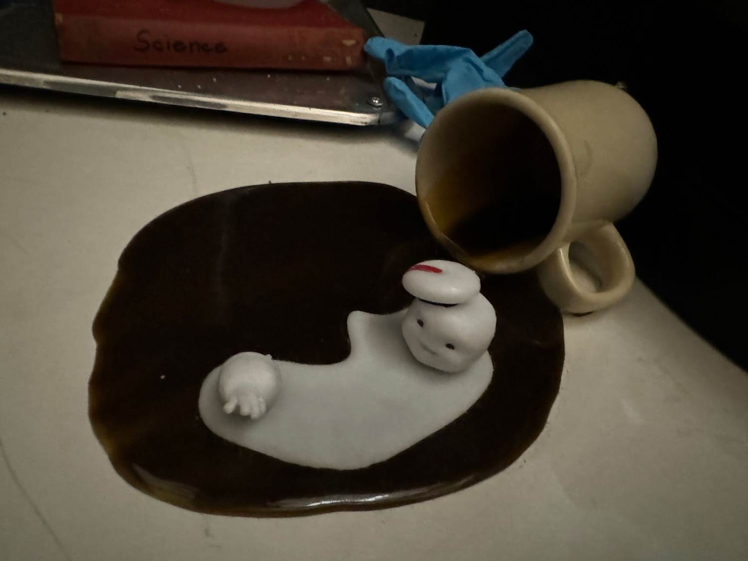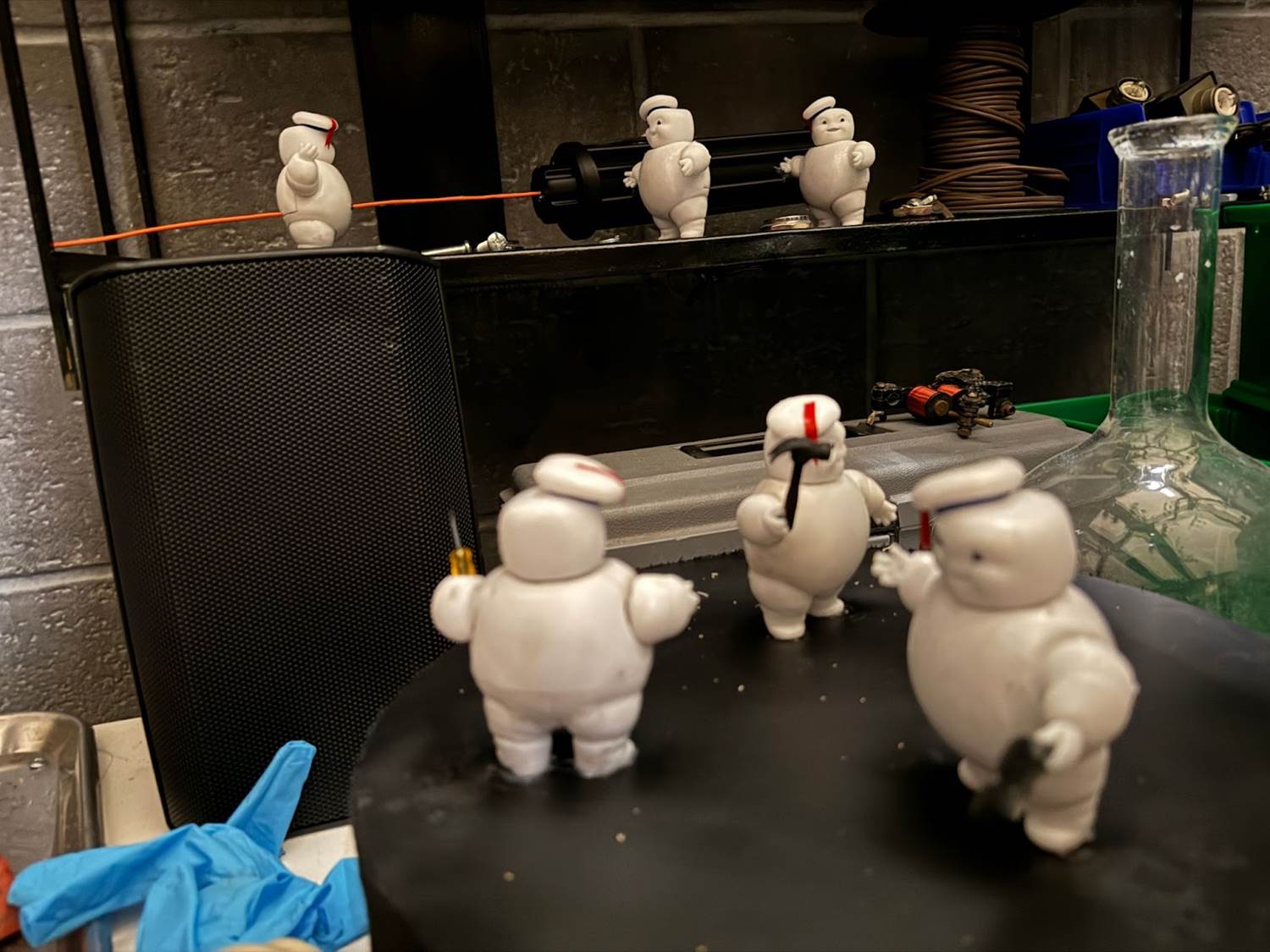 “We didn’t do that last time, so we thought, ‘Oh, that's good.’ It's a little dark, hard to see, but there's pink slime everywhere. There's another Mini-Puft that got lost and he's riding a rat like a bucking bronco. Then as you're going through the sewer, as soon as you step through this curtain, you get attacked by the Miner Ghost, which is actually from the movie [Ghostbusters:] Afterlife. And then you run into the Sewer Dragon. I think that's the only thing that's not physically here right now because my makeup artist is busy painting it– it's massive. So the whole thing tracks forward, and then we take you into the Ghostbusters’ new lab which is overrun by many [Mini-]Pufts. These are fun– we have the coffee cup that spilled and melted one of them. The hand and the head are animated. Then we have a cannibal one toasting his friend on the Bunsen burner like it's a S’more, and then we have the other ones with a laser. That's actually all lights up. They're shooting a hole through their friend with a laser, and then this is actually a turntable where there's one guy trying to run away from two other ones that are trying to kill him."