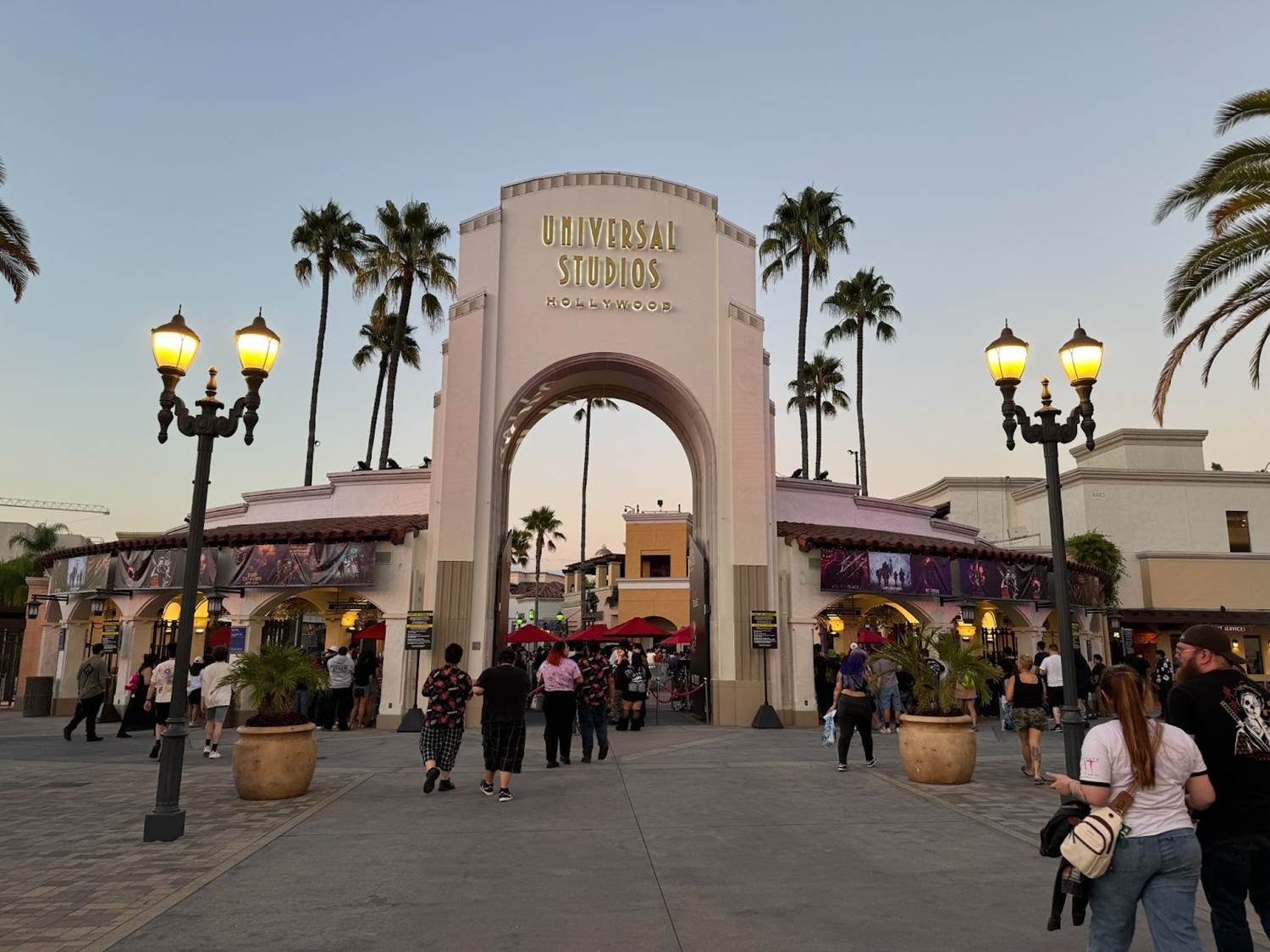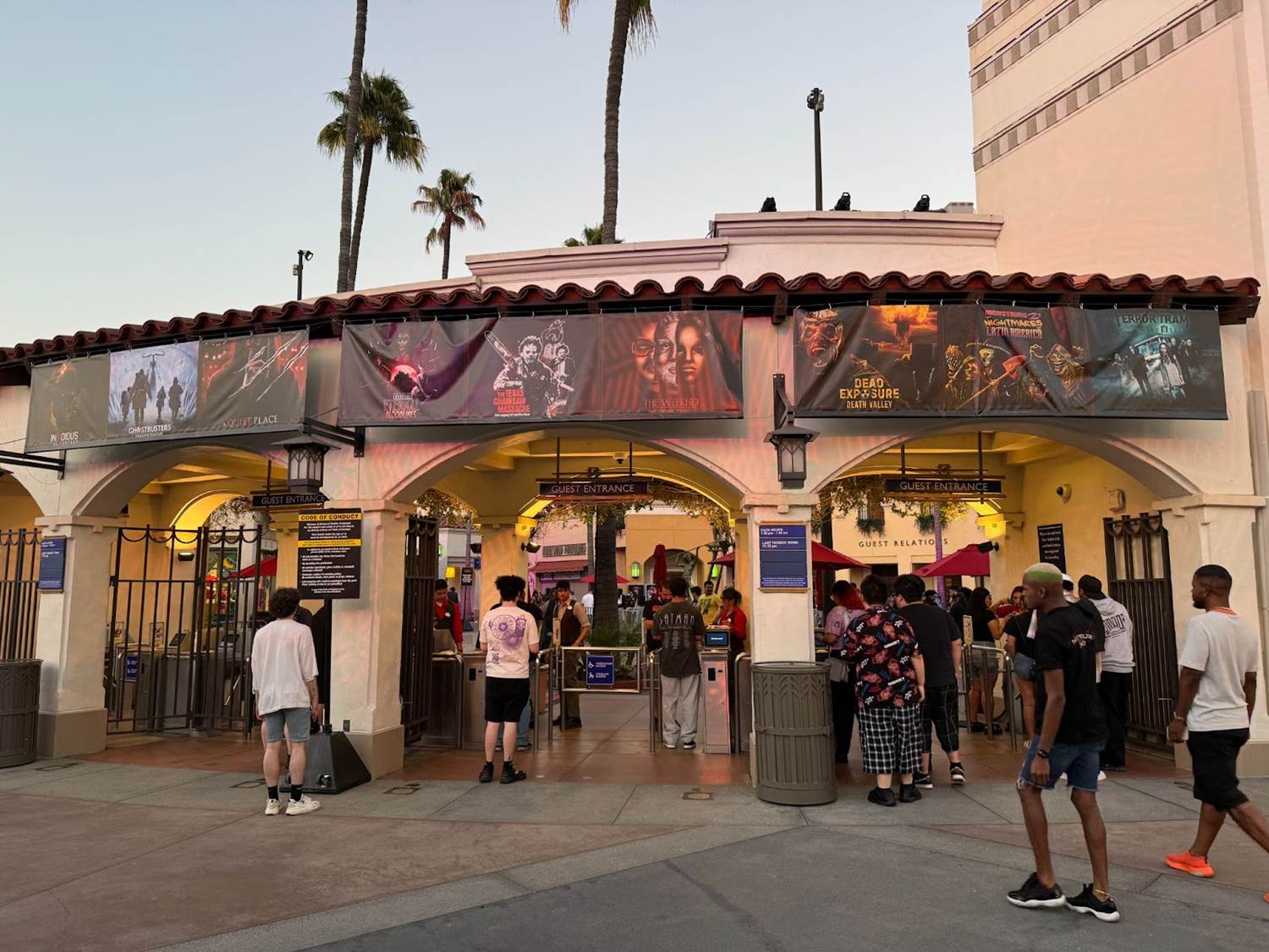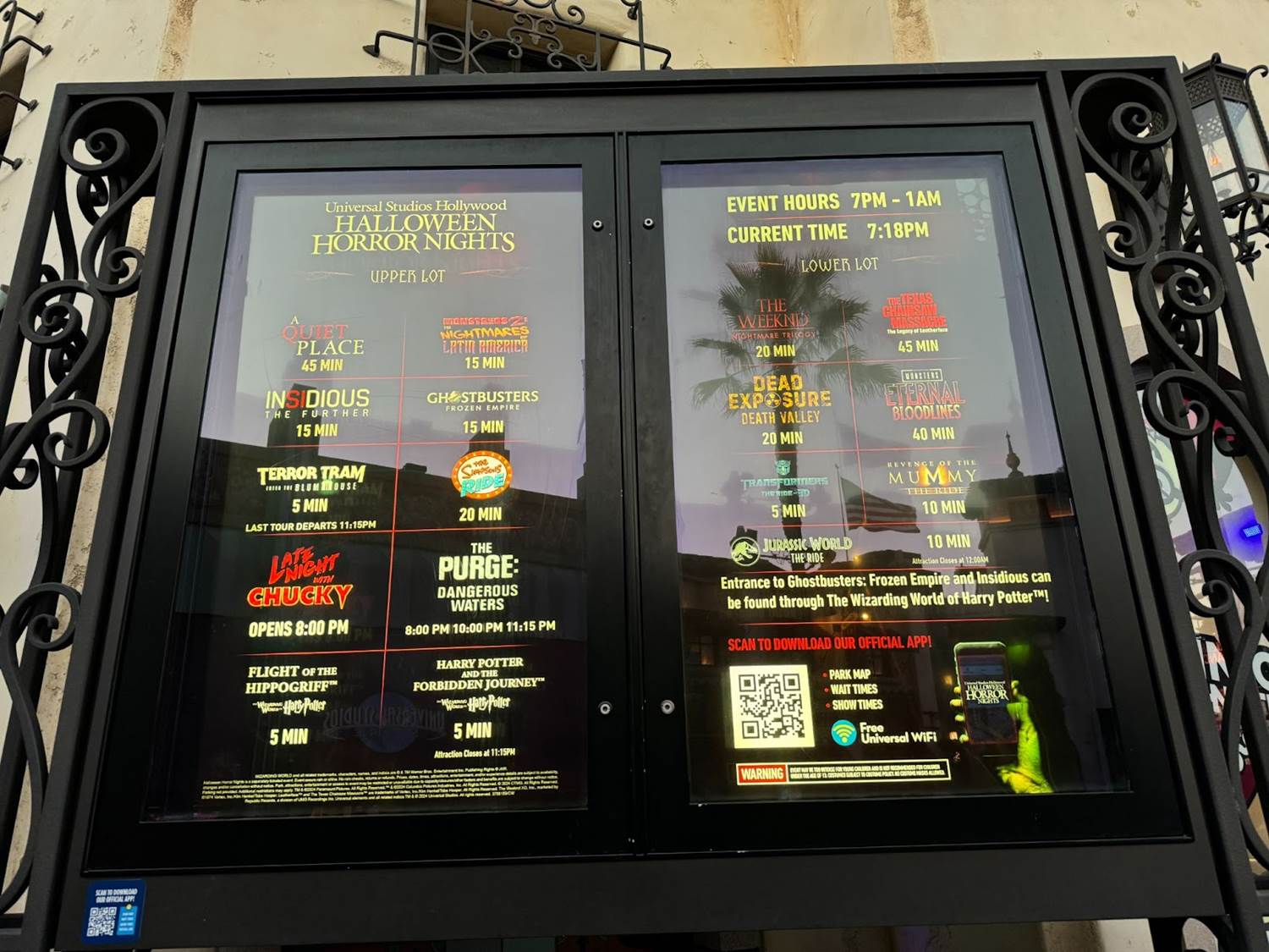 As we entered Universal Studios Hollywood itself, we found the entrance to the theme park decked out with banners and signs promoting Halloween Horror Nights. And within, there was a departure board letting guests know how long they could anticipate waits for haunted houses and other attractions being around the park.