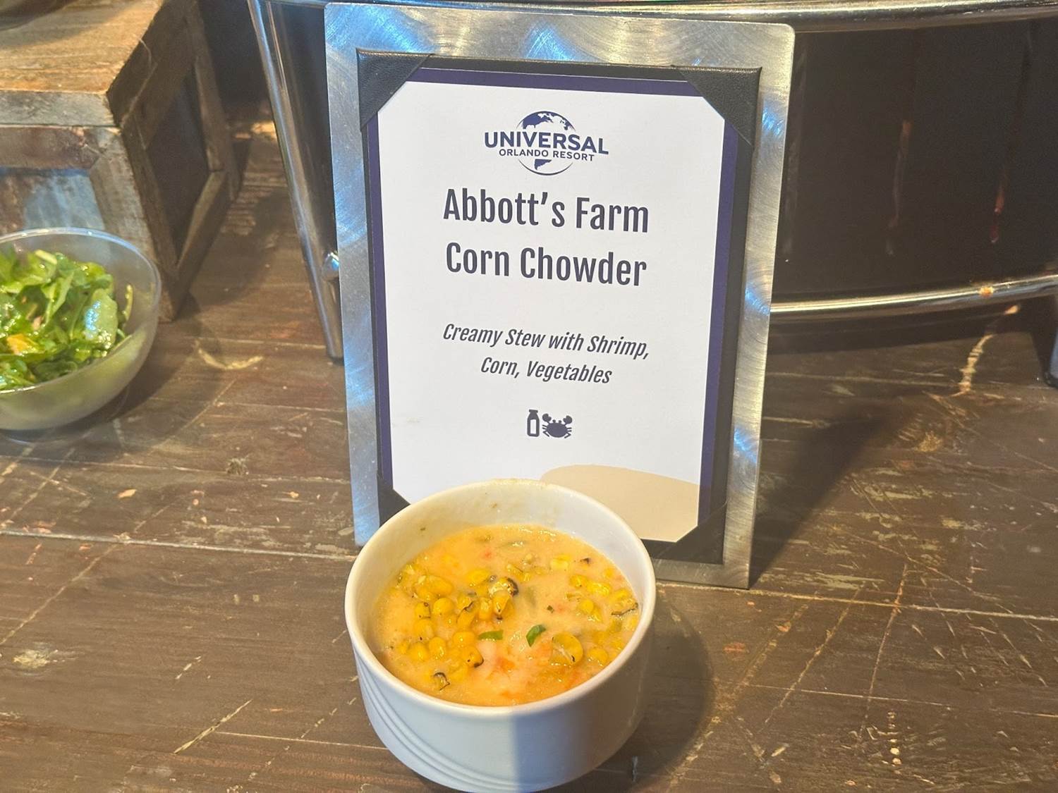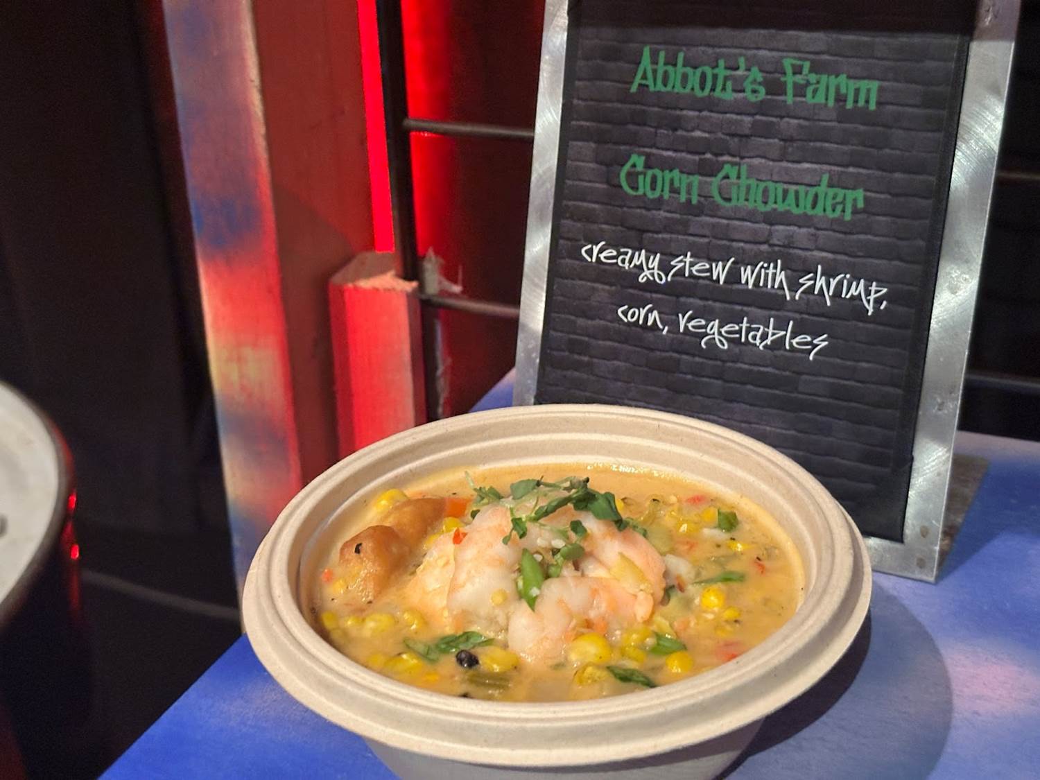 - Abbott’s Farm Corn Chowder – creamy stew with shrimp, corn and vegetables