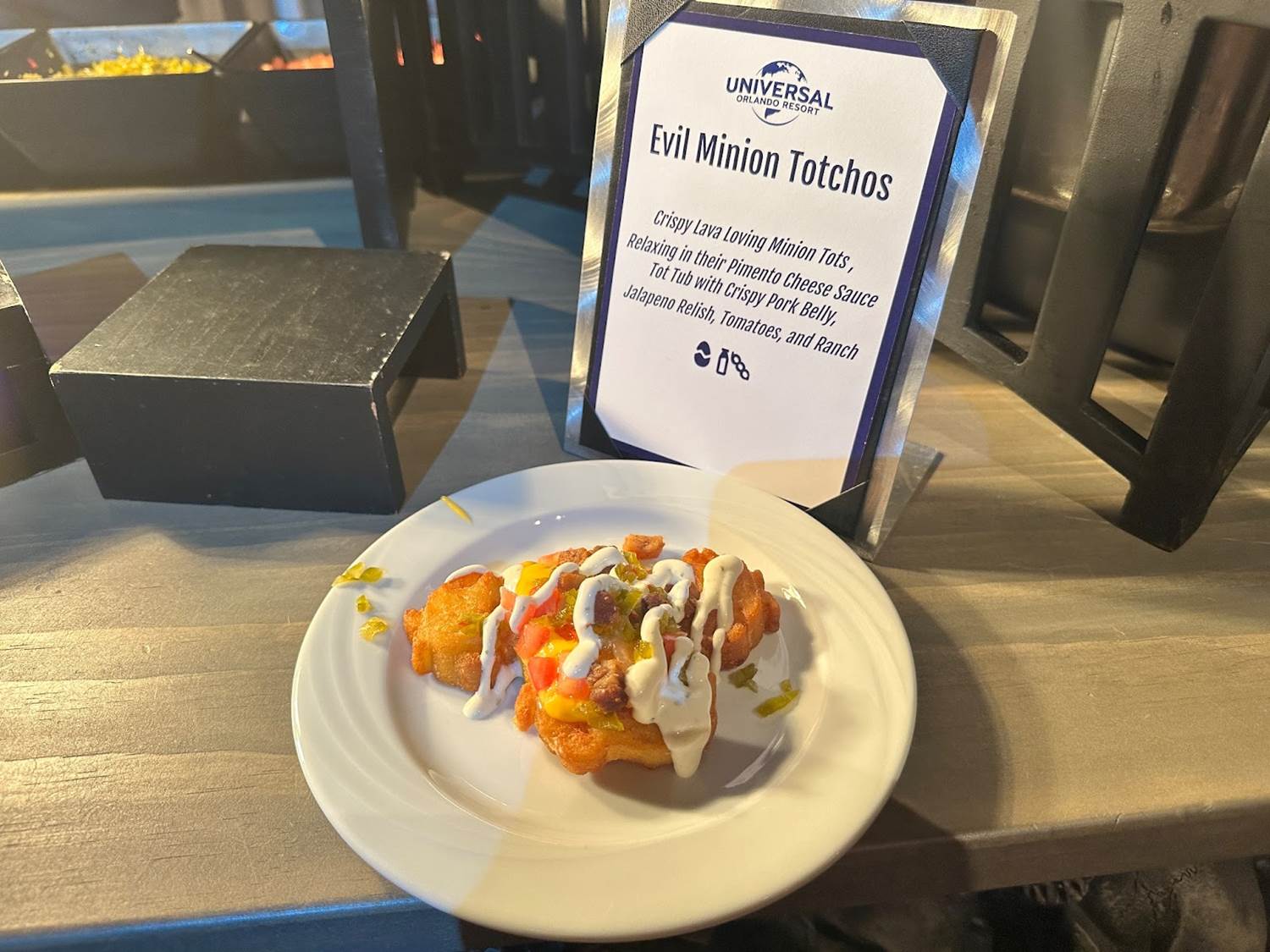 - Evil Minion Totchos at Minion Cafe – crispy lava loving Minion tots in pimento cheese sauce with crispy pork belly, jalapeno relish, tomatoes and ranch.