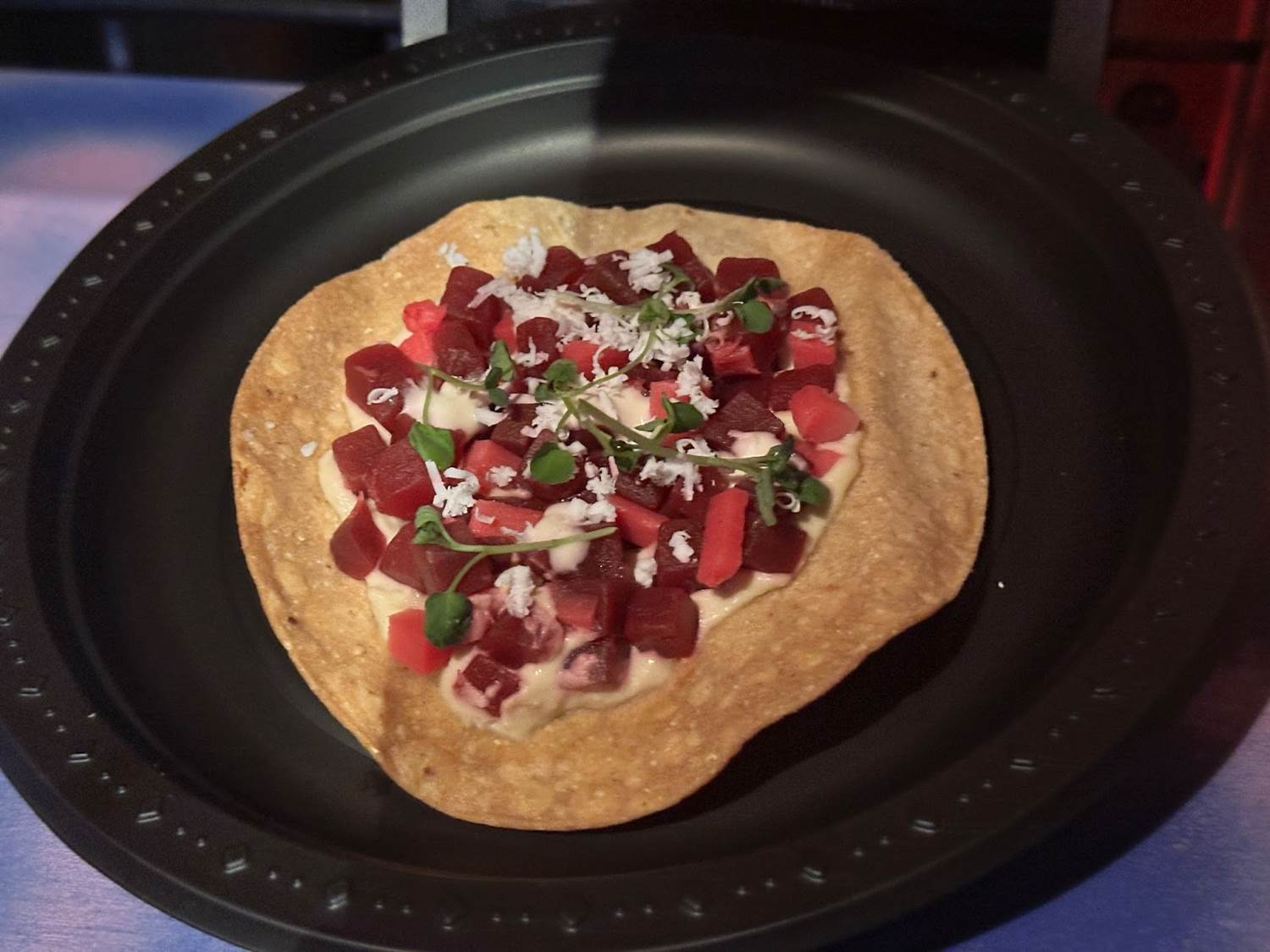 - Heart Beat Tostada – red beet tartare with hummus, vegan feta and watercress on a crispy tortilla