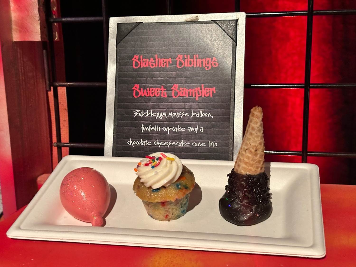- Slasher Siblings Sweet Sampler – bubblegum mousse balloon, funfetti cupcake and a chocolate cheesecake cone trio