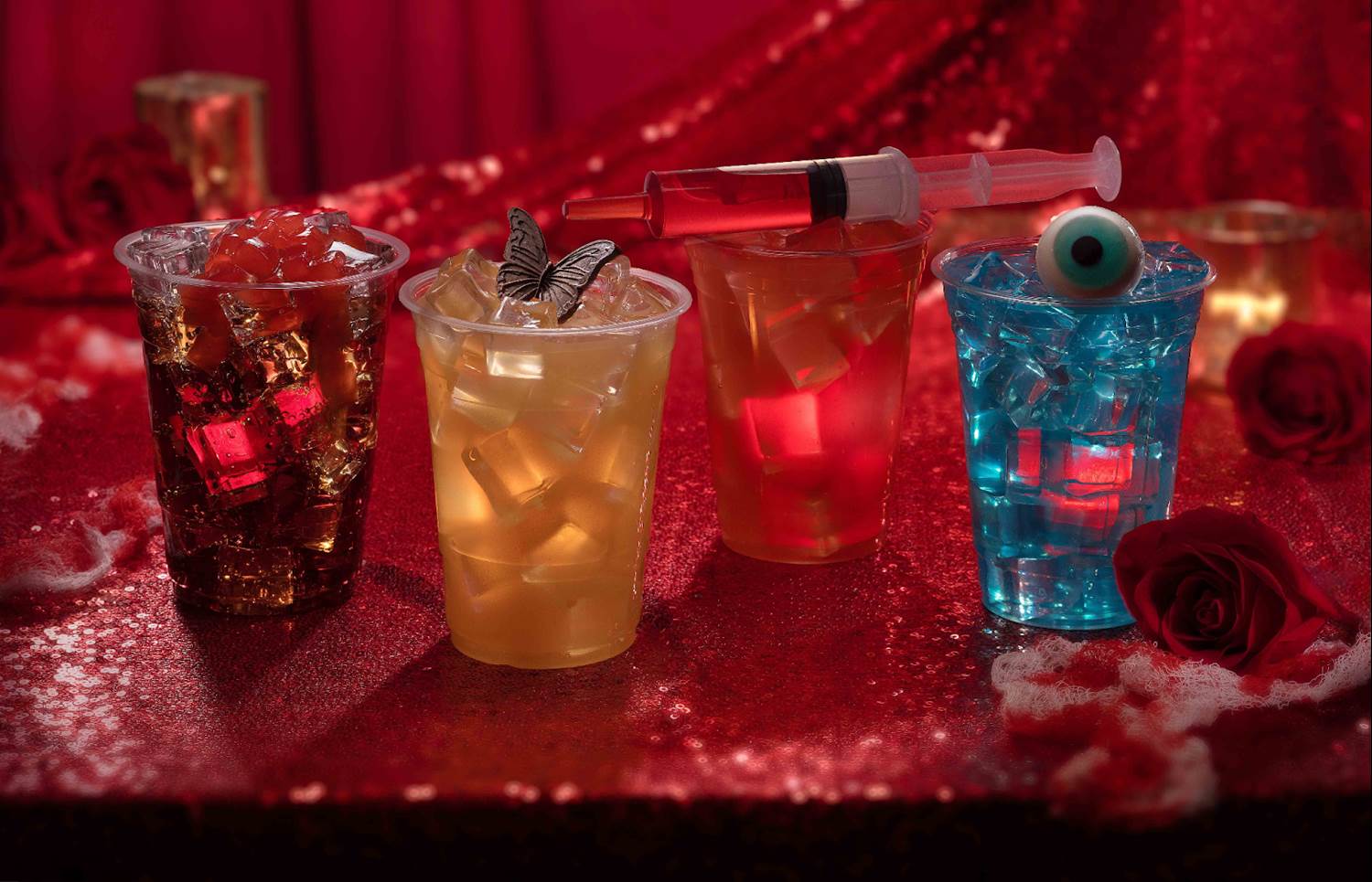 - Out of Time – cola, raspberry and ginger syrup and a red light up cube, topped with strawberry heart jellies