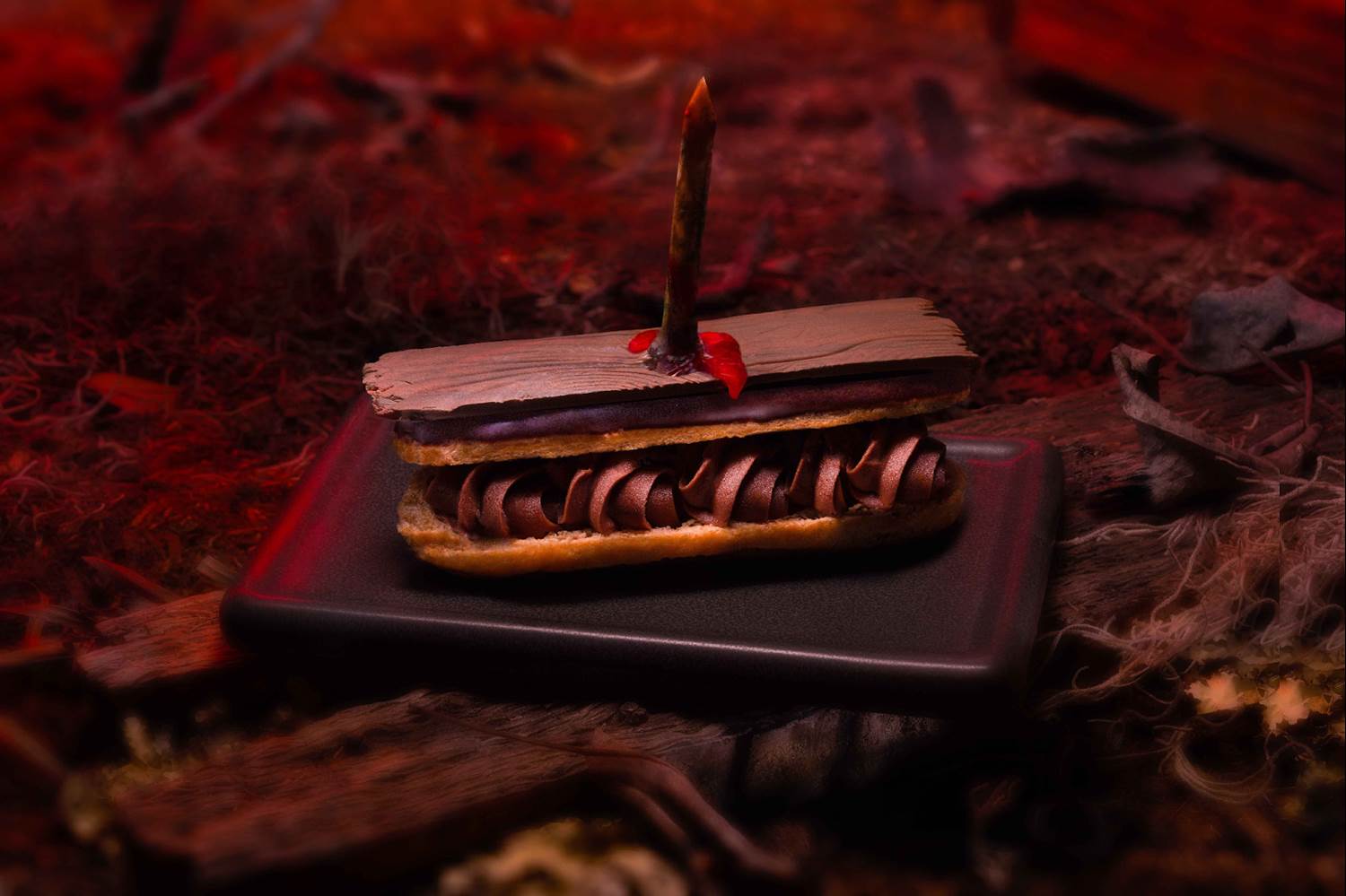 - Wooden Board Éclair – dark chocolate mousse filled éclair dripped in chocolate ganache