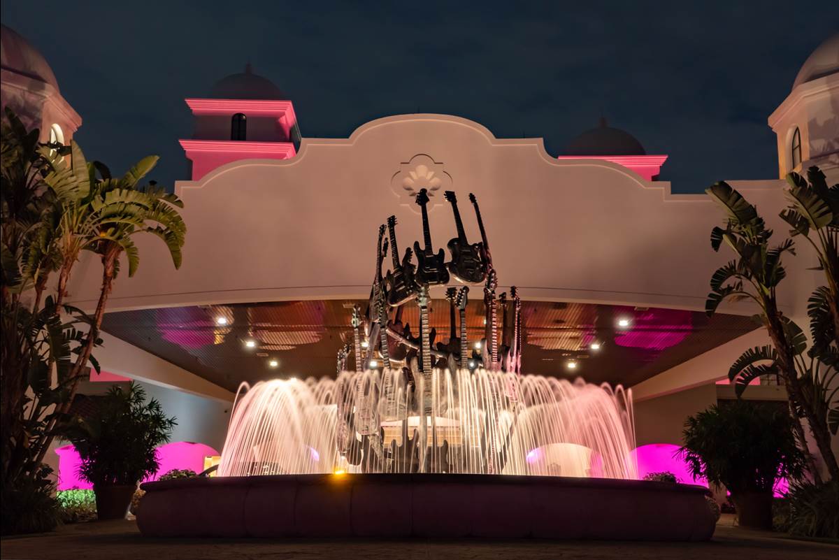 - The front of the hotel and its iconic guitar fountain are lit up in pink to support PINKTOBER.