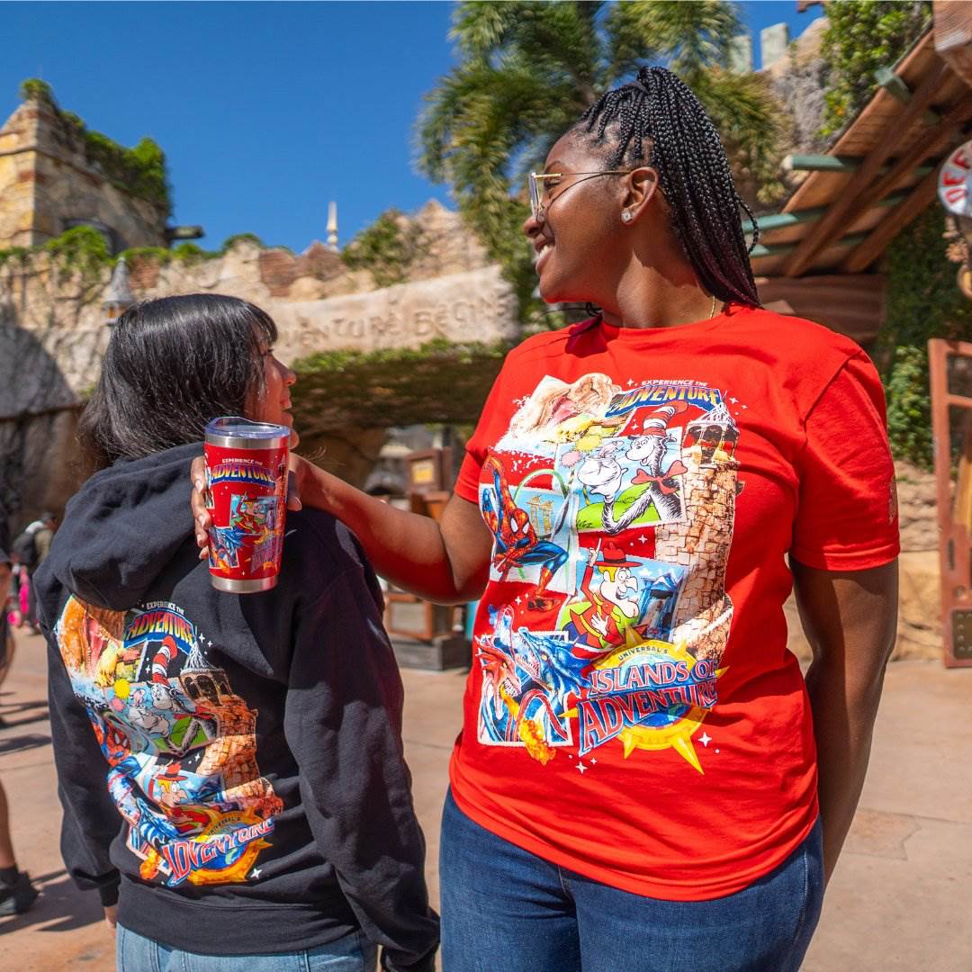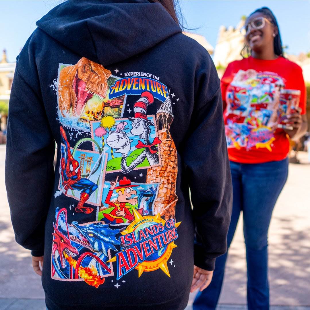 - The collection features a T-Shirt, hoodie, tumbler and a pin, all featuring the same design which includes a number of classic Islands of Adventure attractions and characters, such as: