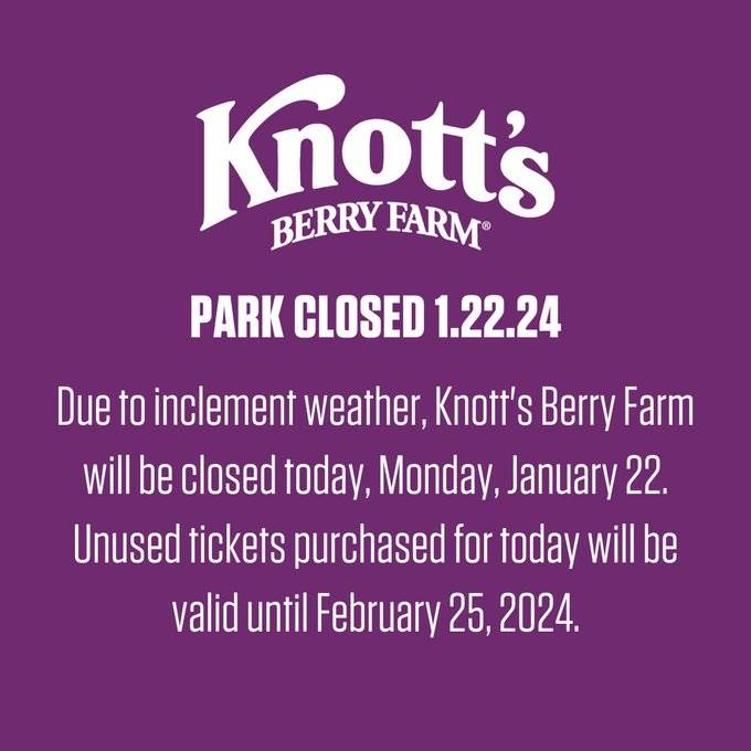 - Due to inclement weather, Knott’s Berry Farm will be closed today, Monday, January 22.