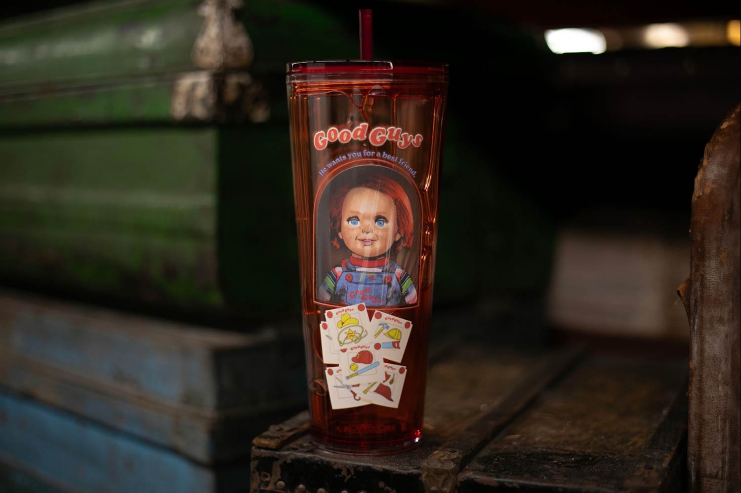 - Showcase your bloody good drinks in the all-new reusable cup. The tumbler features a blood dripping effect and designs highlighting the murderous toy.