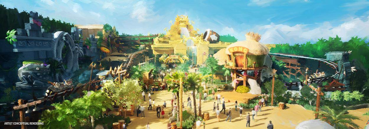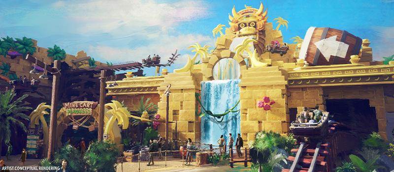- At the edge of Super Mario Land, guests will discover an entrance that leads them to Donkey Kong Country, where they’ll explore the lush, tropical landscape from the video game series, complete with tall trees, waterfalls, landmarks such as The Golden Temple and more. Here, guests can enjoy: