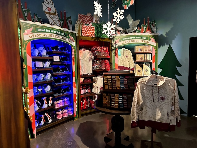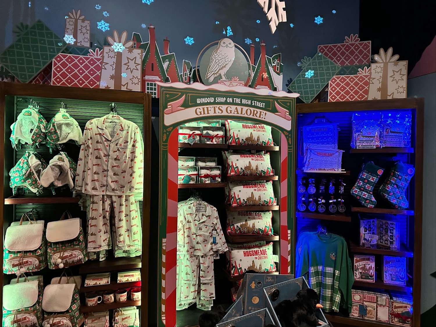 Visitors will find merry merchandise celebrating the Christmas season in Hogsmeade with apparel, accessories, home decor, and toys.