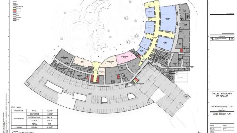 - The nearly 30-acre project, with the codename "Starboard," would include a walkway to the theme park, conference center, ballroom, parking garage, fitness center, restaurant and rooftop bar and terrace, among other amenities, as seen in the site renderings.