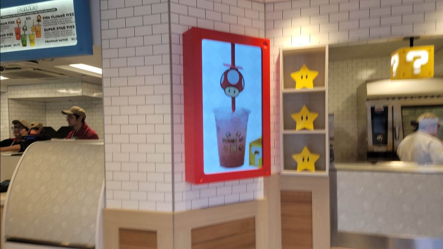 - Super Mushroom Fizz: Lemon lime soda with strawberry popping pearls and a strawberry Super Mushroom Power Up