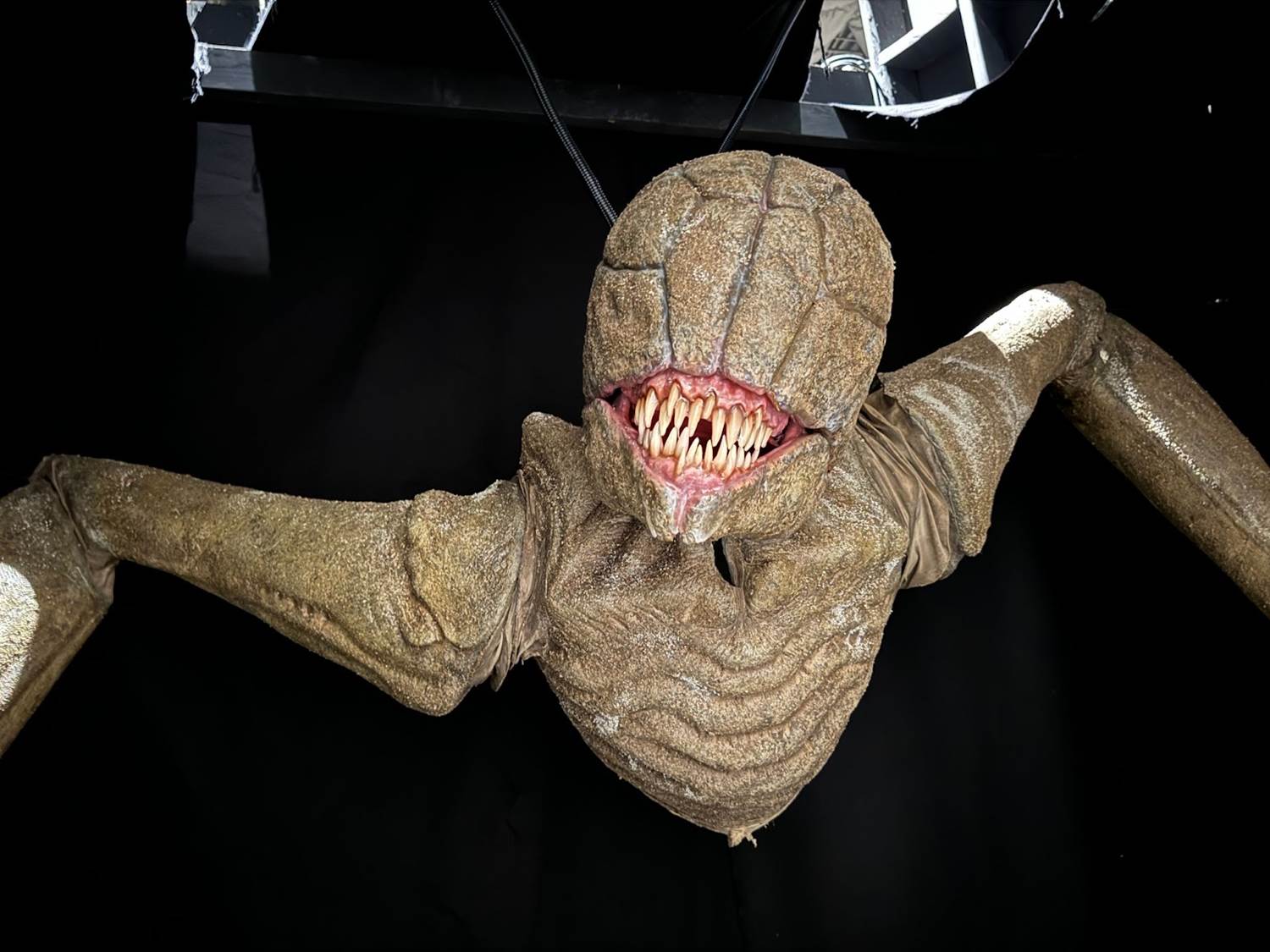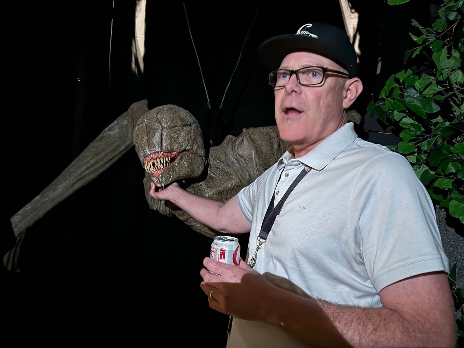“As soon as we get to this point, once the creatures start making noise, we pass through this curtain and we immediately run into the first [one]. This is a puppet. The performer can make the mouth open. There's ten of these in the house, [and] these are all built by Patrick Magee and Magee FX, which is our long time makeup artist that works with us. We started with all these behind-the-scenes elements we get from the film, so we have all these technical drawings of this guy. We blew it up really big and put them up on the office wall, and then took different people from our team and stood [them] next to it just to try to figure out what size was gonna work. While Horror Nights was going on last year, we did a whole audio mockup while the event was running in our facility to test out the near field audio design and see if that was gonna be the way to approach it. I started in March working with my counterparts in Orlando and some folks on our marketing team to curate the slate for the following year."
