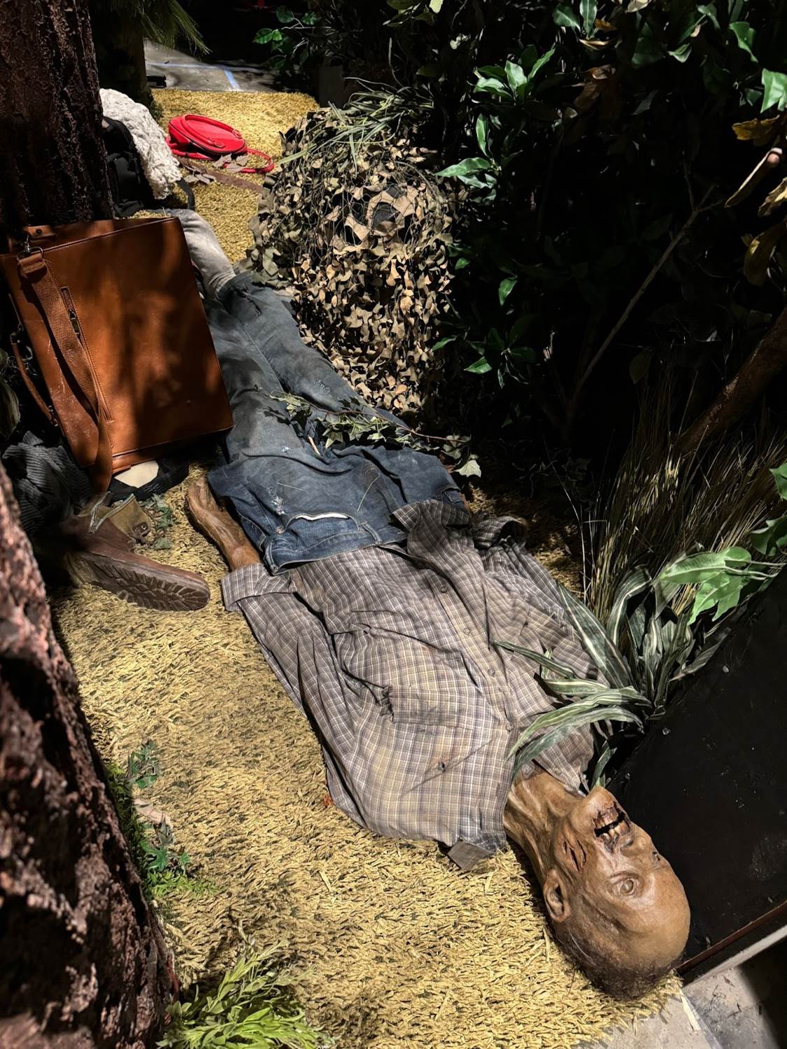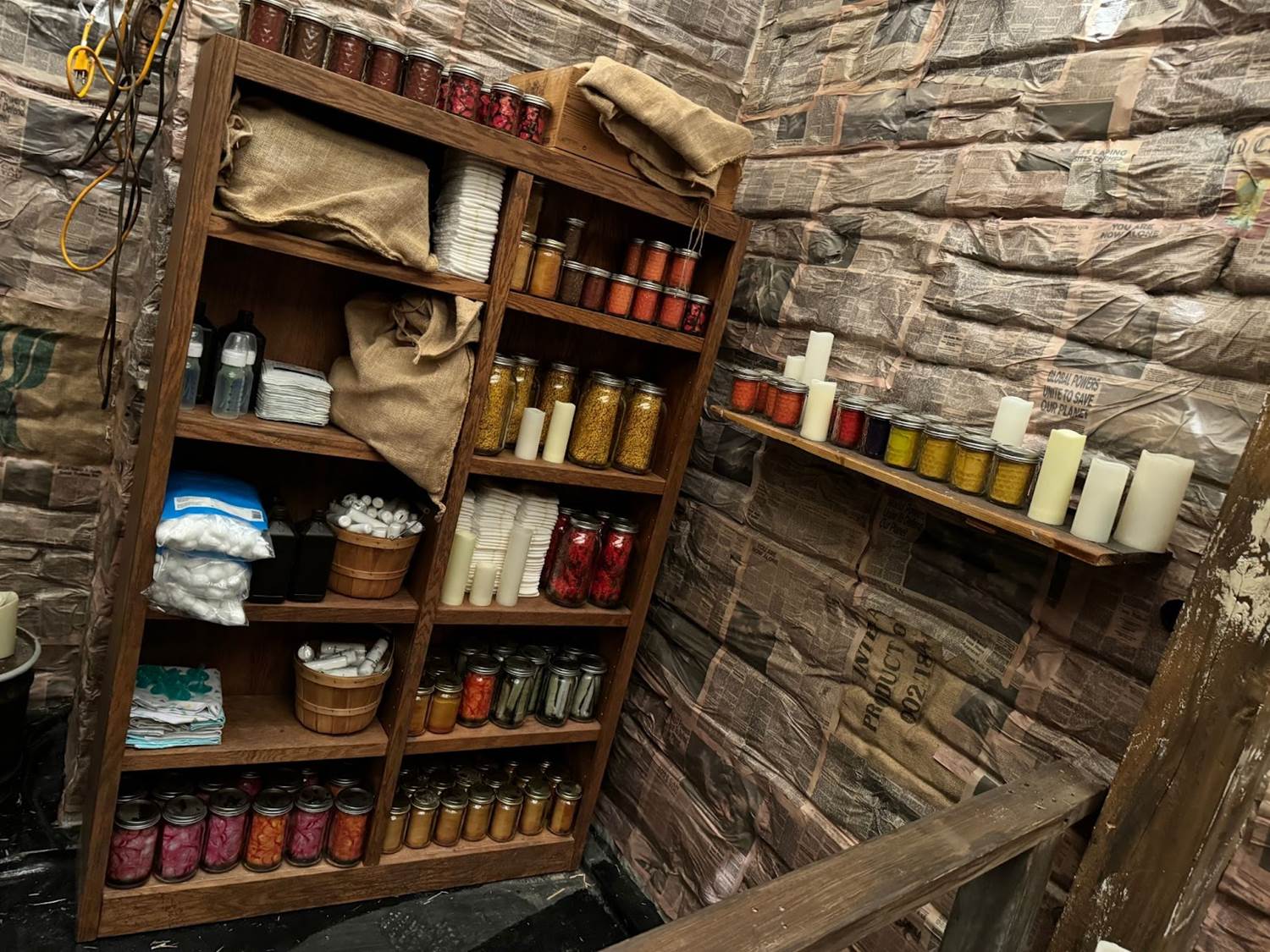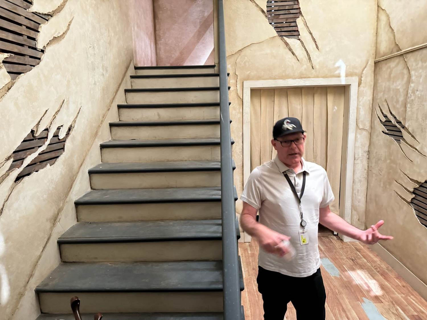 “And then we go inside the barn [where there] is another animated figure. When you walk in here, you hear the baby start to cry and this guy is gonna rise up above the baby, and then there's a compressed air and water blast. Then [this is] a good example of props and dressing– not only all of the canned goods [but] all of the labels, [and] we have to create all of the newspapers that they're using for insulation in the scene. So everything you see [is] stuff that we generated that then [the props department] has to change and apply. And this is the dividing line between the first film and the second film– we're gonna switch to the second film when we go outside. This is a big deep set again [with] a fully animated figure. The character in the scene is Emmett– you hear his shotgun go off and then he comes around the corner. He's gonna use ASL telling you to get to the foundry, which is his hideout. And then we're heading to the foundry. This is where Marcus steps in a bear trap, so [there’s] an effect to make it look like the performer's leg is stuck in a bear trap."