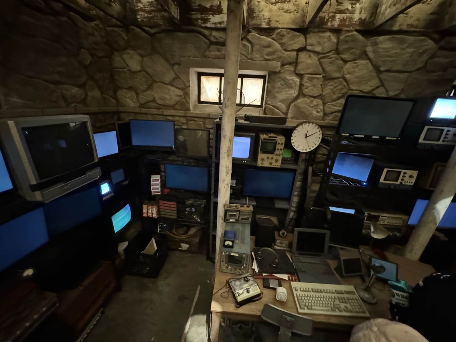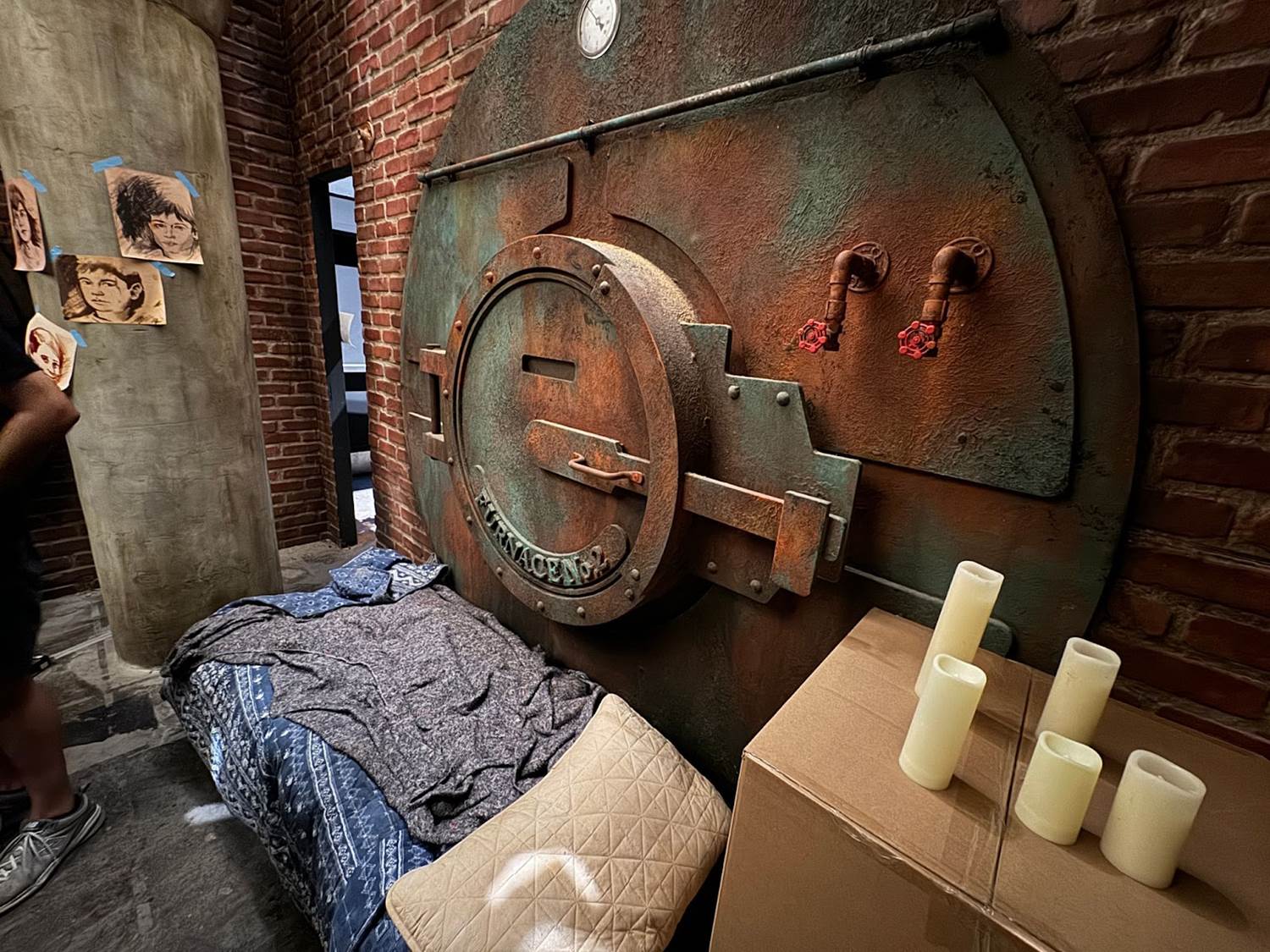“What's nice about this desk is that you actually could put a speaker right on it– the speaker just kind of belongs in a desk. Most of the time we're hiding them, but this one is the point source speaker for it. All the monitors are on when you're going through, but this one is really about showing off the hero creature, because once you [trip] the sensor, it raises up, it lunges forward– it’s in your face. The performer over there has the ability to stop it if need be, but it's being triggered off that banner sensor, which is kind of like how we did the humvee in ‘Last of Us’ last year; that's how we did that. Certain ones, we give it to the performer to control like in ‘Ghostbusters,’ the performer's actually deciding when to make the ECTO-1 do its thing. But in certain cases, we'll do a banner sensor like that. It's a combination of these things. That's the thing with Horror Nights– we try to get things as close to you as possible. Our performers like to get close, which is kind of amazing. [Our team locks] every single thing down– every single part has to be locked down. In a room like this, that's just hundreds, [and there are] a lot of rooms like this in ‘Quiet Place’ that are just super prop-happy– lots of props in dressing."