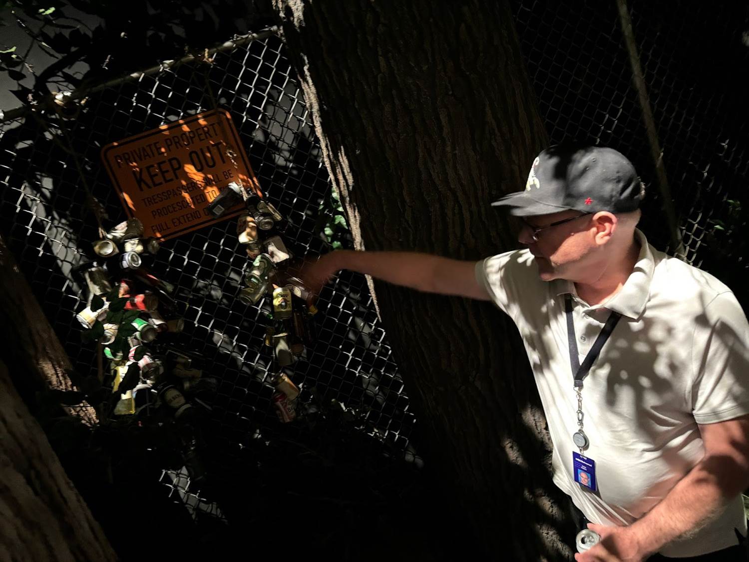 “In the film, Lee and Marcus– the son– were off on an expedition and they come across this old man in the middle of the woods and his wife has just been killed by one of these creatures. And the old man looks like he's about to unleash this horrible scream and they're like, ‘No, no, no, no, no.’ And then he just goes, ‘Aaaaah!’ and then instantly the creatures come, so that's what we're doing with this scene. Where I'm standing is where the old man performer would be, and then when I was talking about near field audio design, this is what I'm talking about. All of these trees were custom-built for this attraction purely to house speakers. Under show lighting, you don't see grills like you're seeing them [now, and] the two bushes back there are [also] hiding speakers. So we're finding all these different ways of bringing the audio really close to you, because as soon as this performer hits his trigger, we kick in a surround sound effect of the creatures coming from all directions and converging on you."