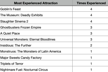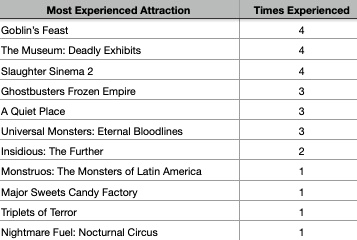 Without Express, we managed only one attraction in our first two visits and the overall APV dropped from 5.5 to 3.8 and a total of just 27 attractions. And while life was the biggest reason for the decline in these numbers, if there is one thing you should take away from them, it is the value of the Express Pass for HHN.