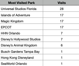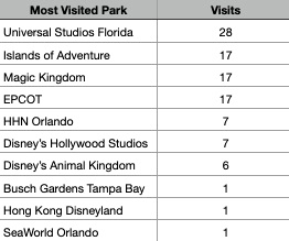 No surprise here. This is the third straight year Universal Studios Florida tops the list. Coincidentally, the gap between USF and my second most visited park, is exactly the same as it was in 2022 (28-17 both years). As always, the 28 visits do not include my visits to Halloween Horror Nights Orlando, as those were counted separately.