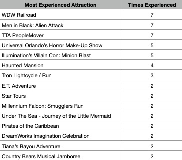 As always, I want to clarify that for this study, I classified attractions as anything that required me to enter an existing queue. Nighttime spectaculars and some other shows and experiences that could easily be entered at any time, were excluded (example: Journey of Water, Inspired by Moana).