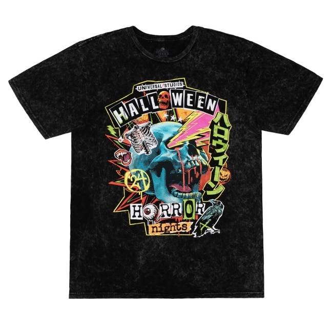 - Get ready for Halloween Horror Nights 2024 with this Official HHN t-shirt in a black acid wash color, featuring a screaming skull with neon graffiti art surrounding it.