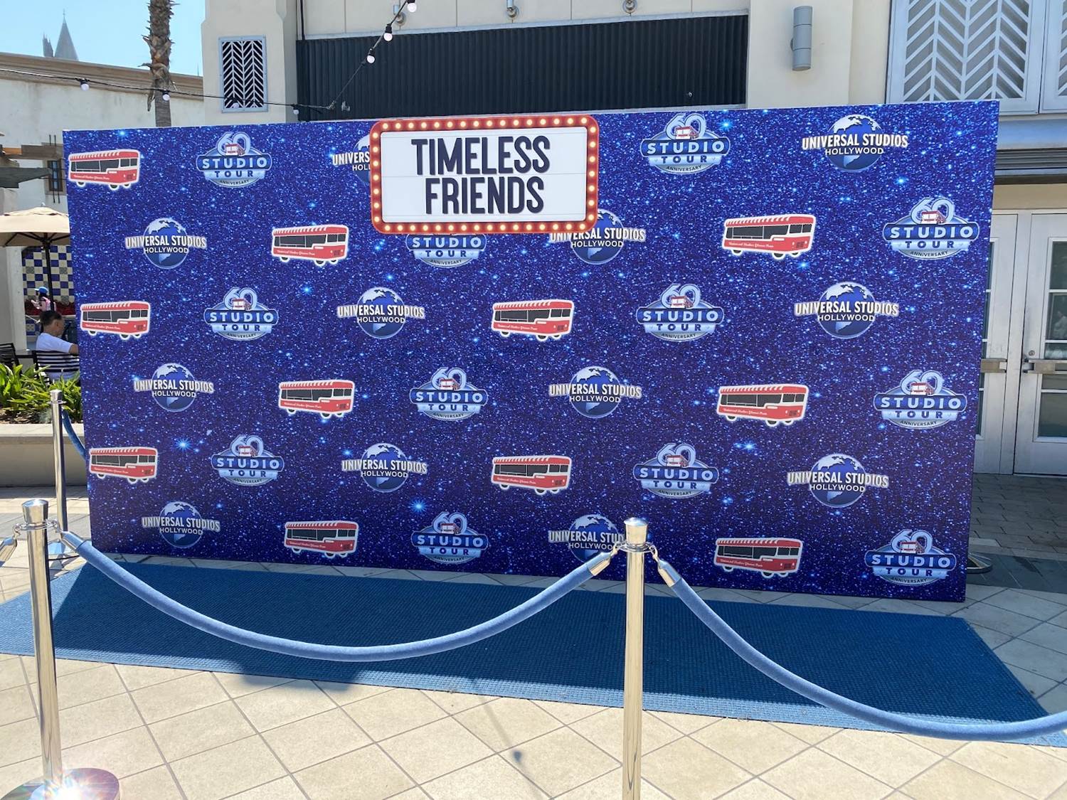 A collage of vintage photos lines the back of the area, showcasing classic elements of the Studio Tour, such as the Parting of the Red Sea, the Burning House, the Collapsing Bridge, and many more!