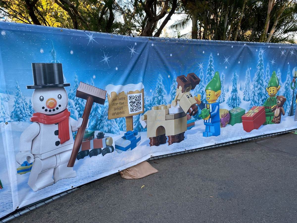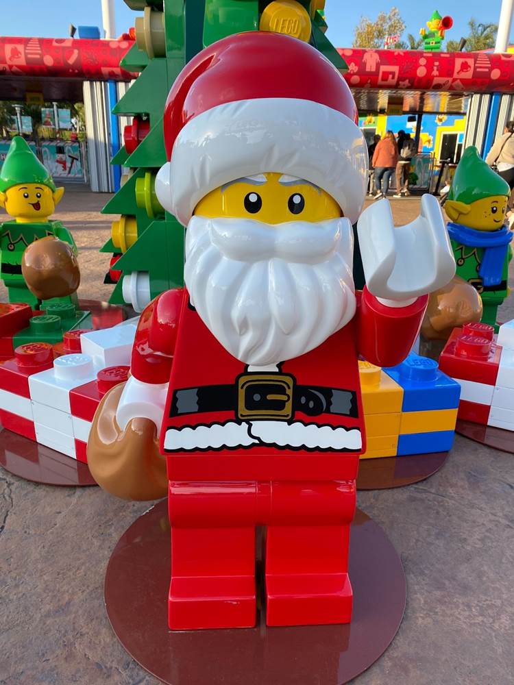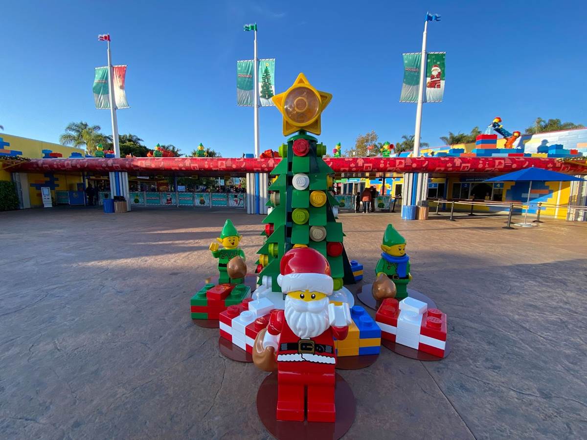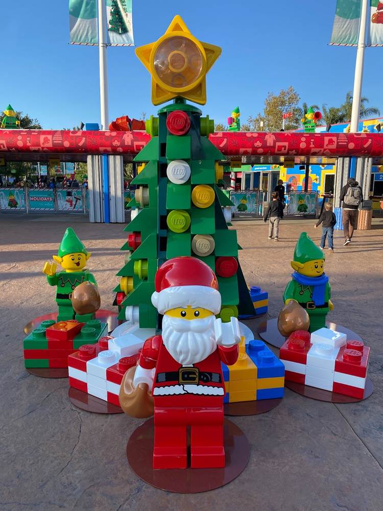 Outside of the entrance to LEGOLAND California, guests will find a statue of LEGO Santa Claus greeting them on the way in, next to a smaller tree made of oversized LEGO.