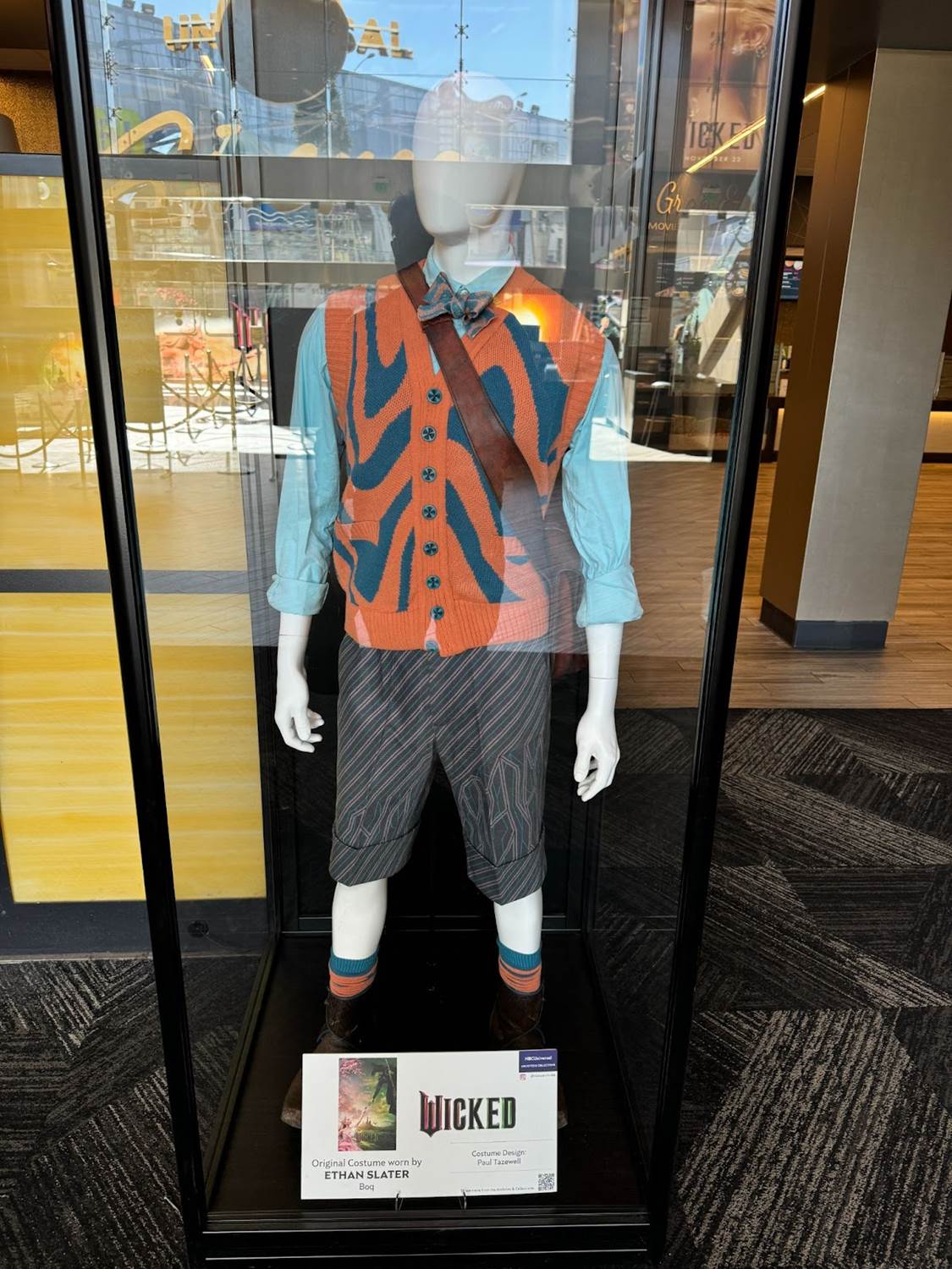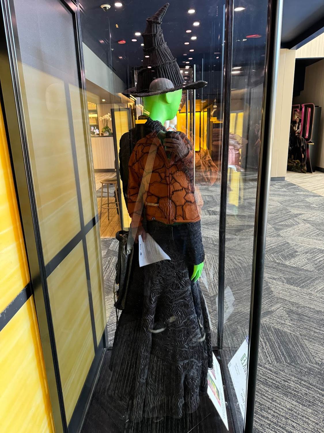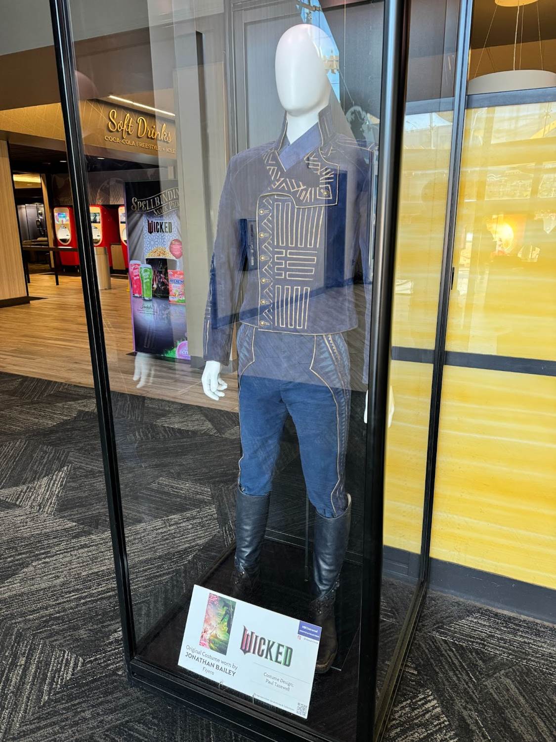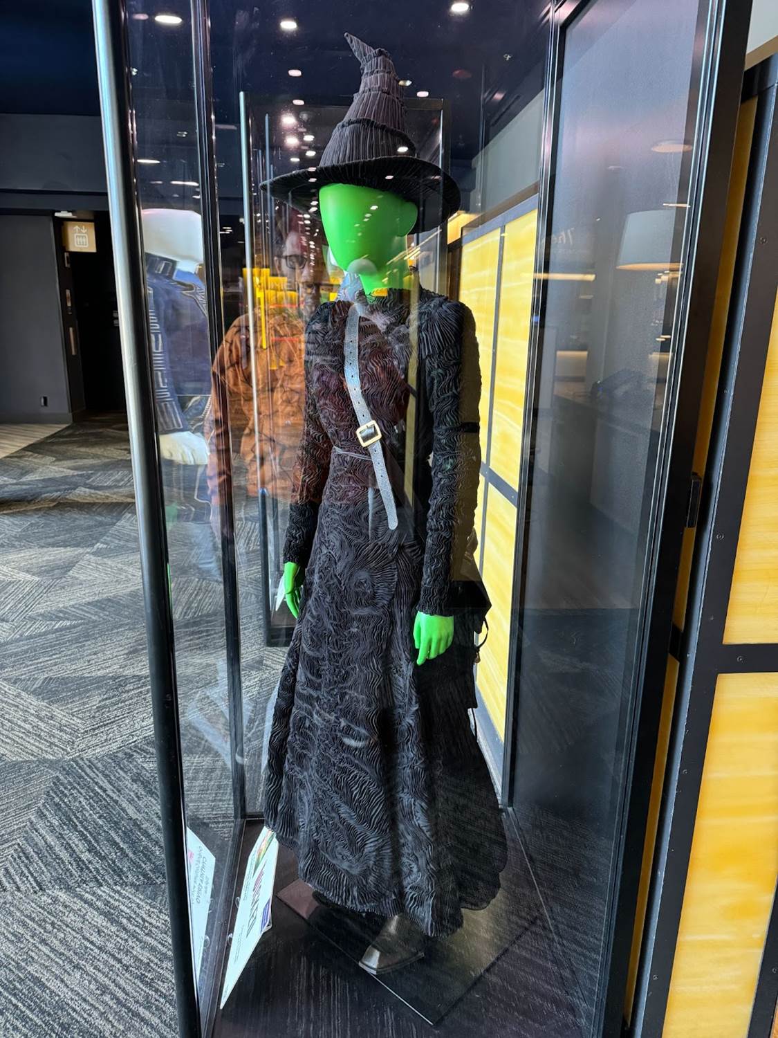 But inside the theater’s lobby is where the really cool Wicked stuff is– actual screen-worn costumes for the characters of Elphaba (played by Cynthia Ervio), Glinda (Ariana Grande), Fiero (Jonathan Bailey), and Boq (Ethan Slater). Not coincidentally, this AMC at CityWalk will be playing Wicked in several different formats, including IMAX.