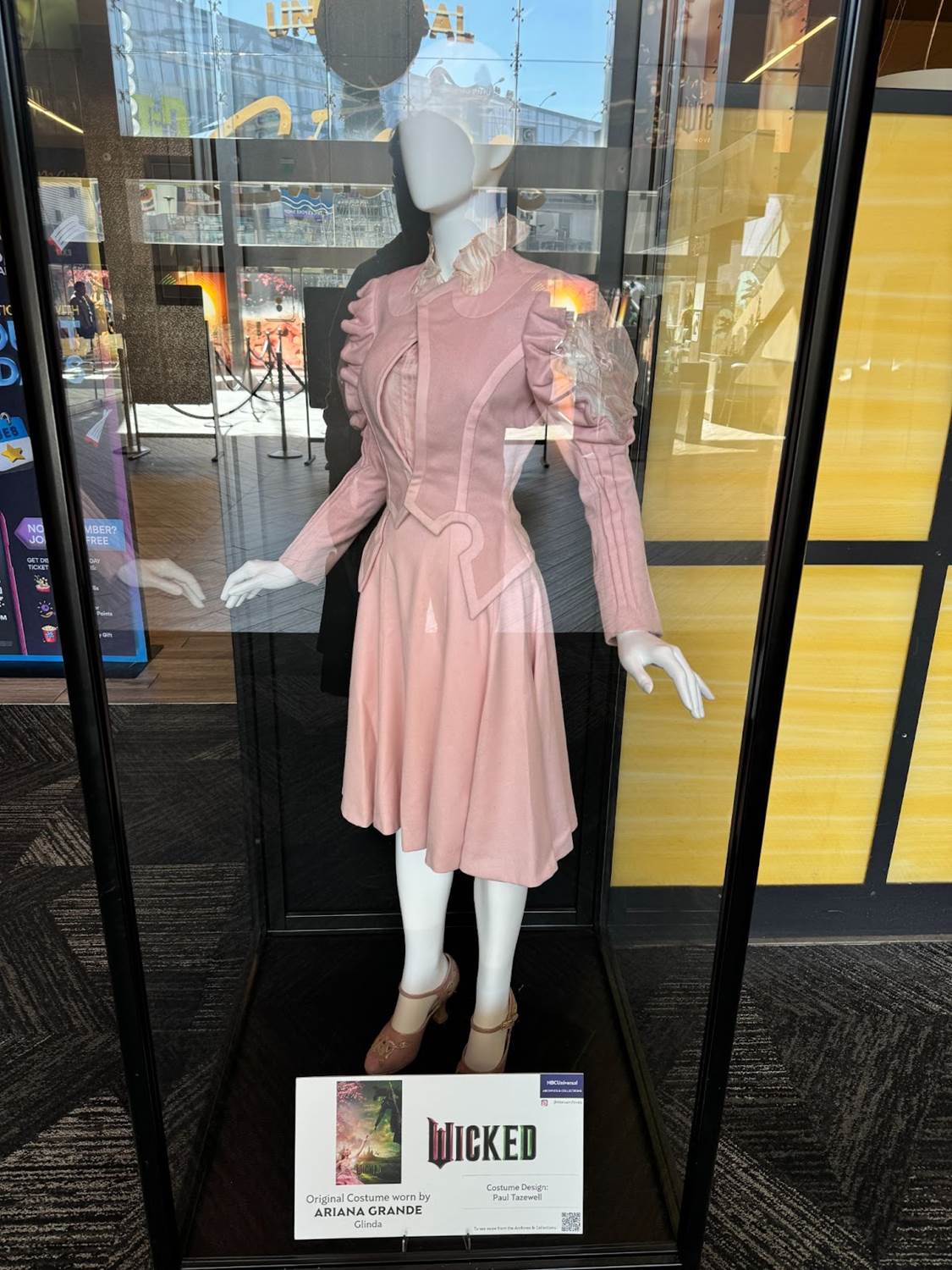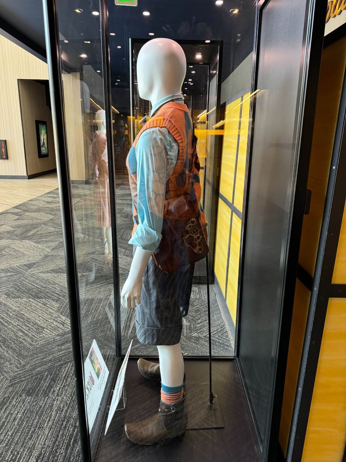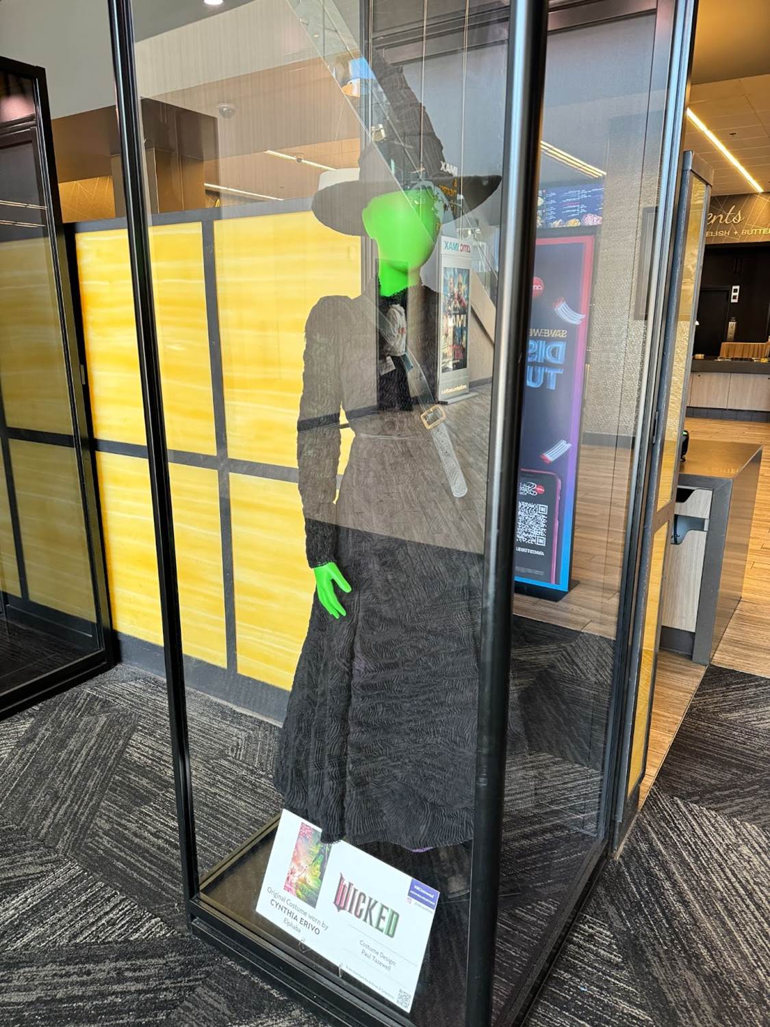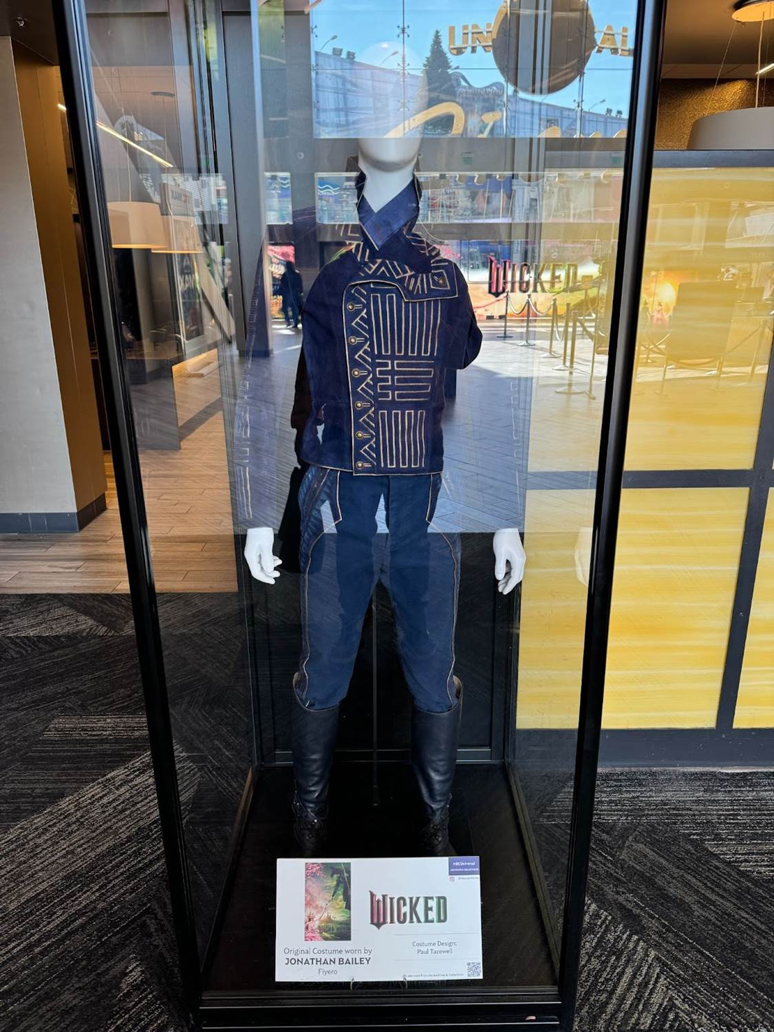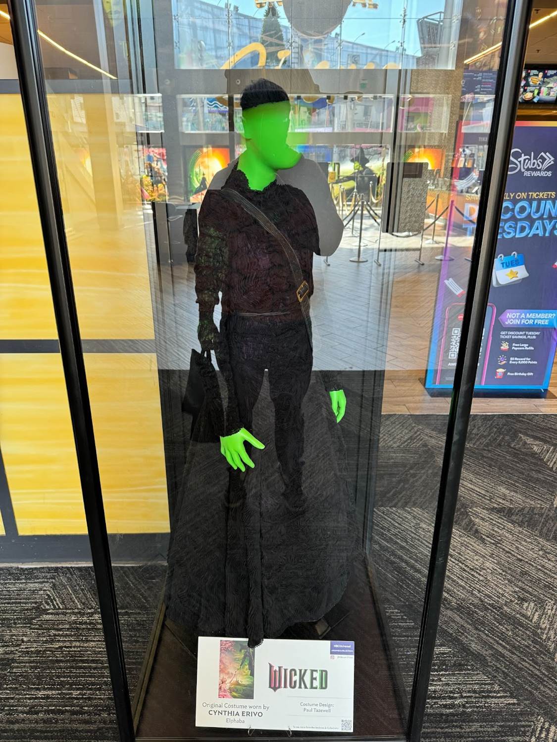 But inside the theater’s lobby is where the really cool Wicked stuff is– actual screen-worn costumes for the characters of Elphaba (played by Cynthia Ervio), Glinda (Ariana Grande), Fiero (Jonathan Bailey), and Boq (Ethan Slater). Not coincidentally, this AMC at CityWalk will be playing Wicked in several different formats, including IMAX.