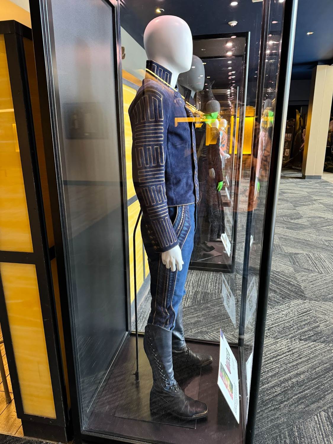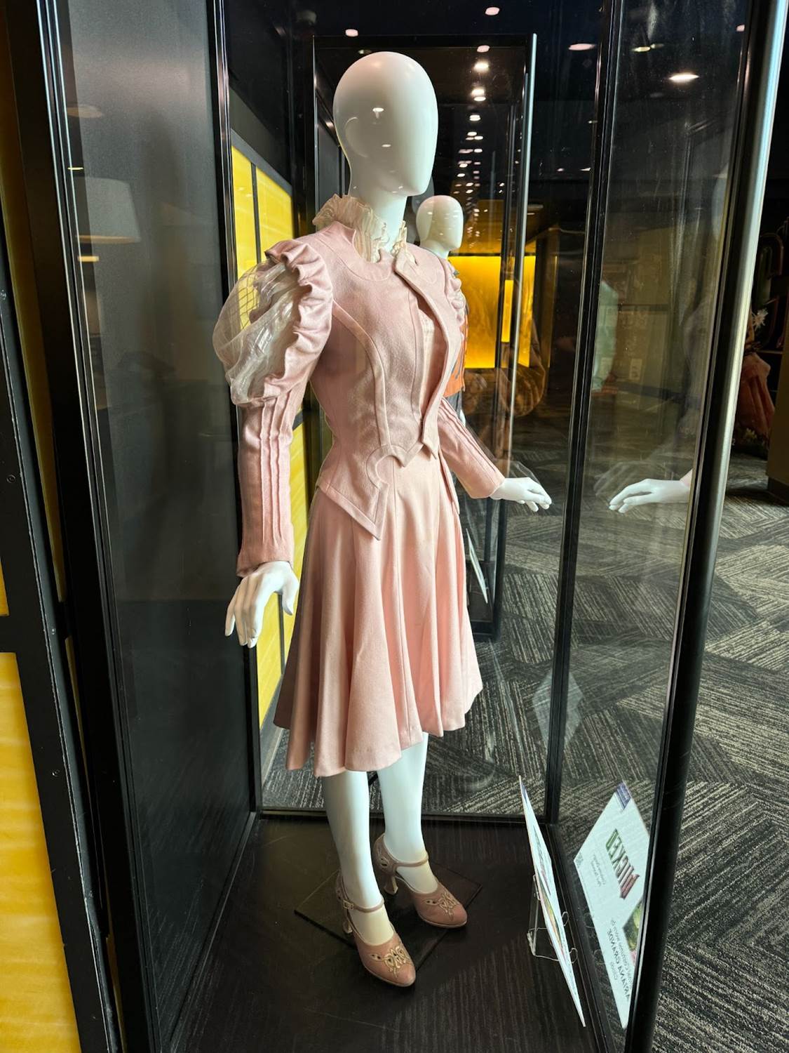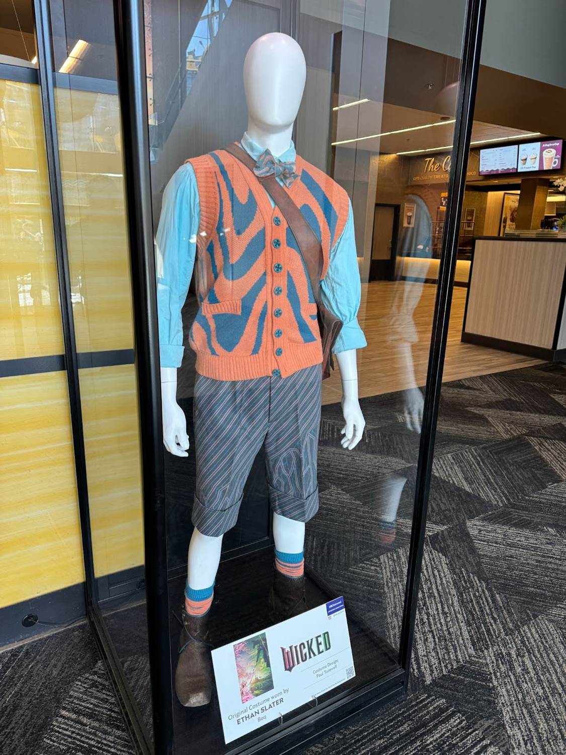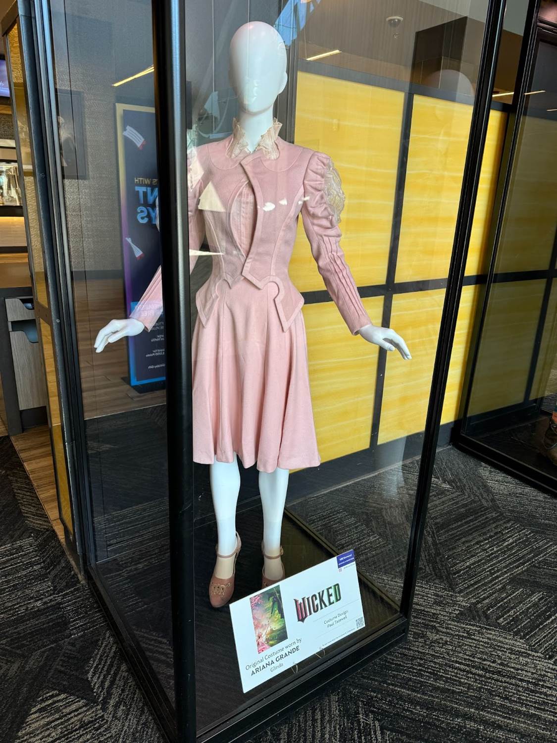 But inside the theater’s lobby is where the really cool Wicked stuff is– actual screen-worn costumes for the characters of Elphaba (played by Cynthia Ervio), Glinda (Ariana Grande), Fiero (Jonathan Bailey), and Boq (Ethan Slater). Not coincidentally, this AMC at CityWalk will be playing Wicked in several different formats, including IMAX.