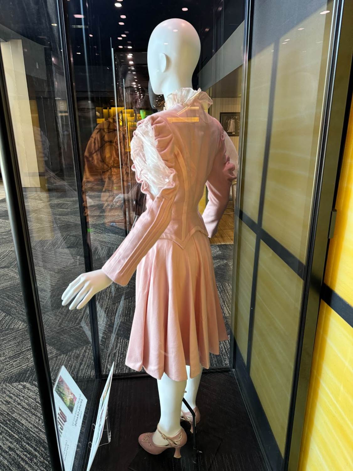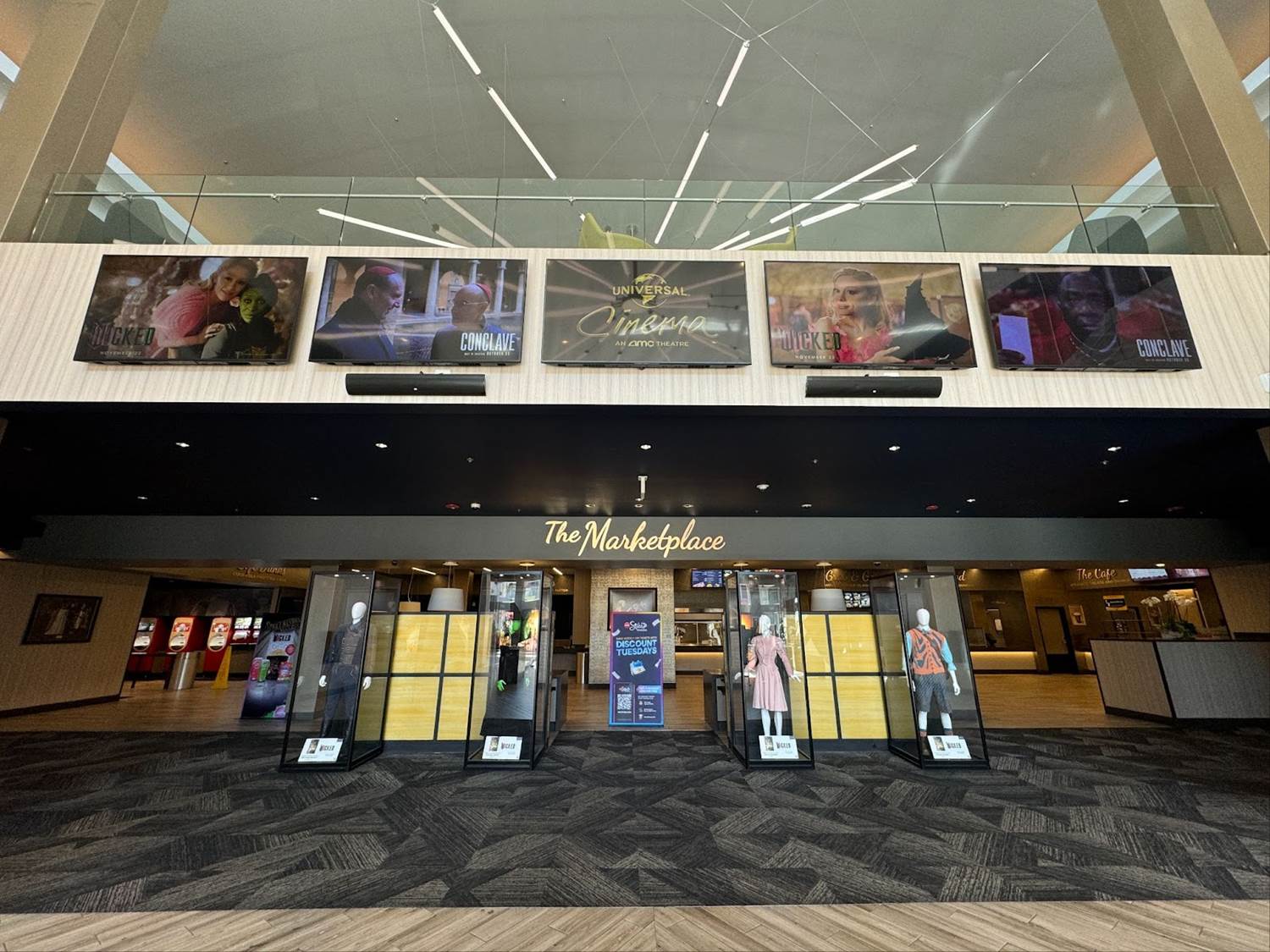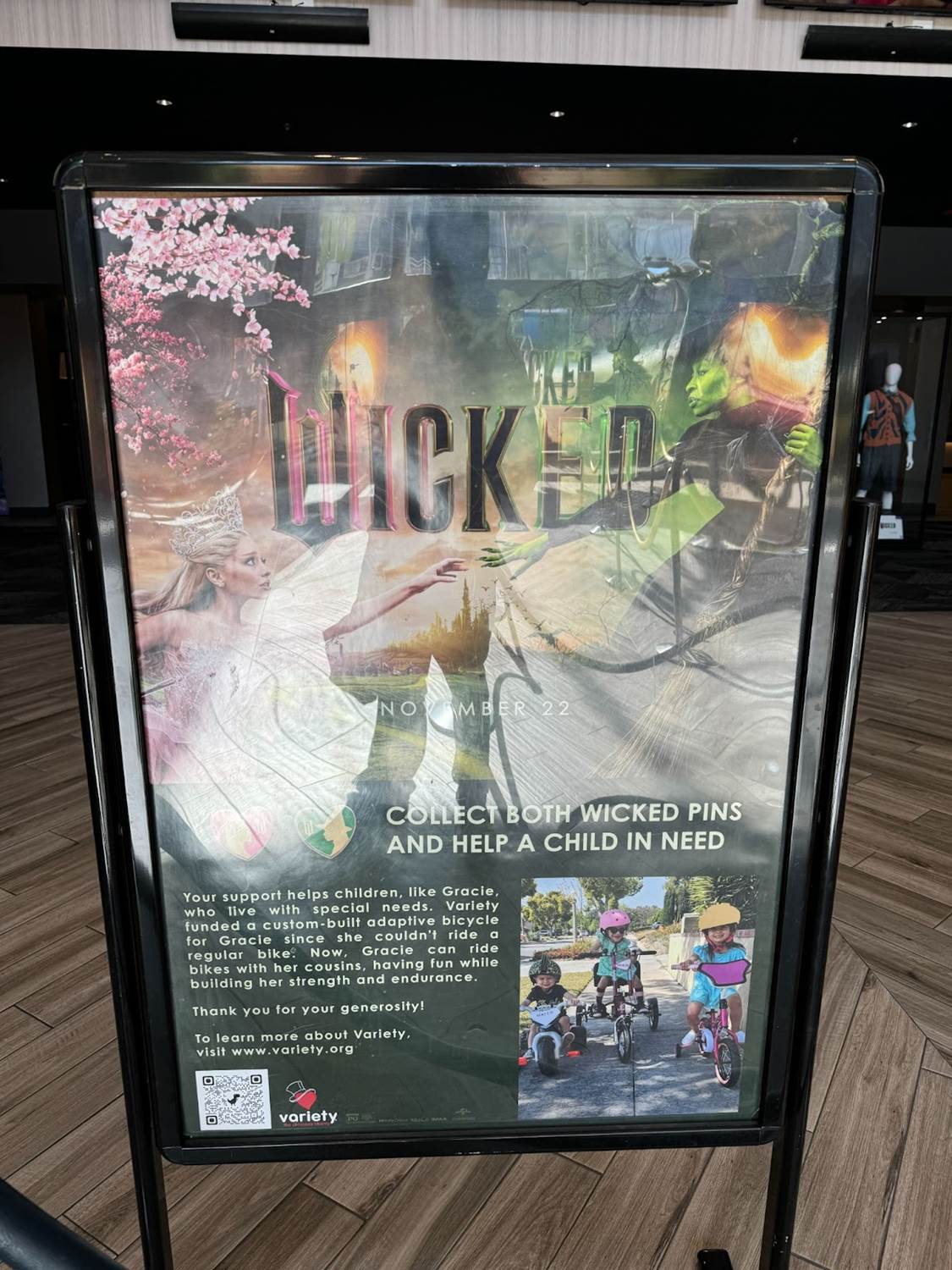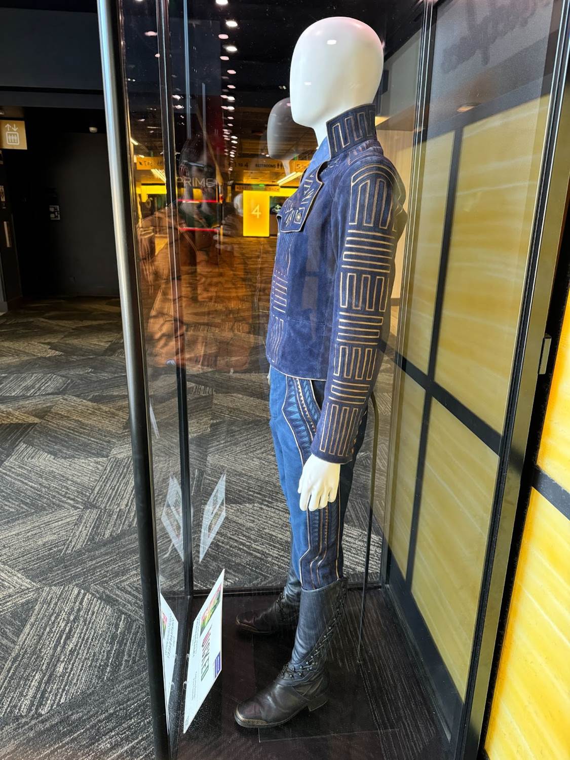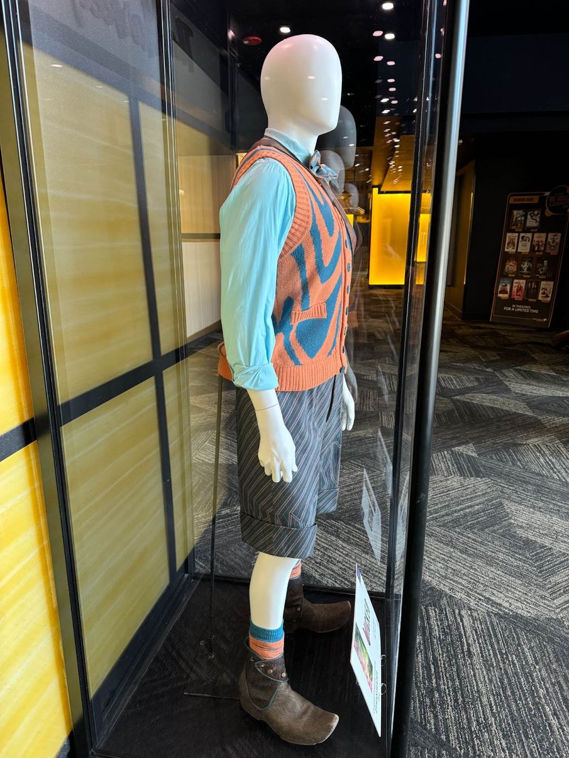 But inside the theater’s lobby is where the really cool Wicked stuff is– actual screen-worn costumes for the characters of Elphaba (played by Cynthia Ervio), Glinda (Ariana Grande), Fiero (Jonathan Bailey), and Boq (Ethan Slater). Not coincidentally, this AMC at CityWalk will be playing Wicked in several different formats, including IMAX.
