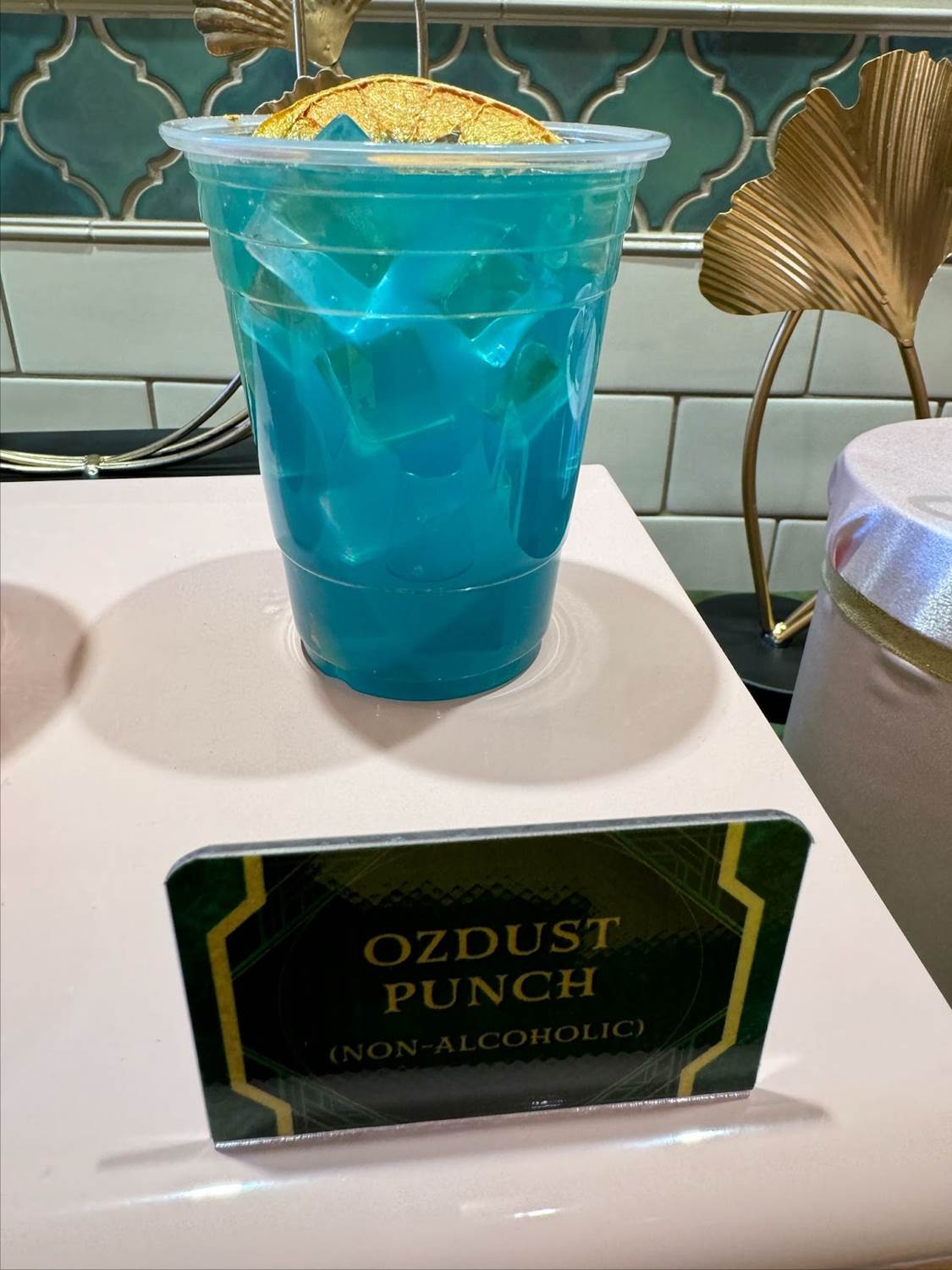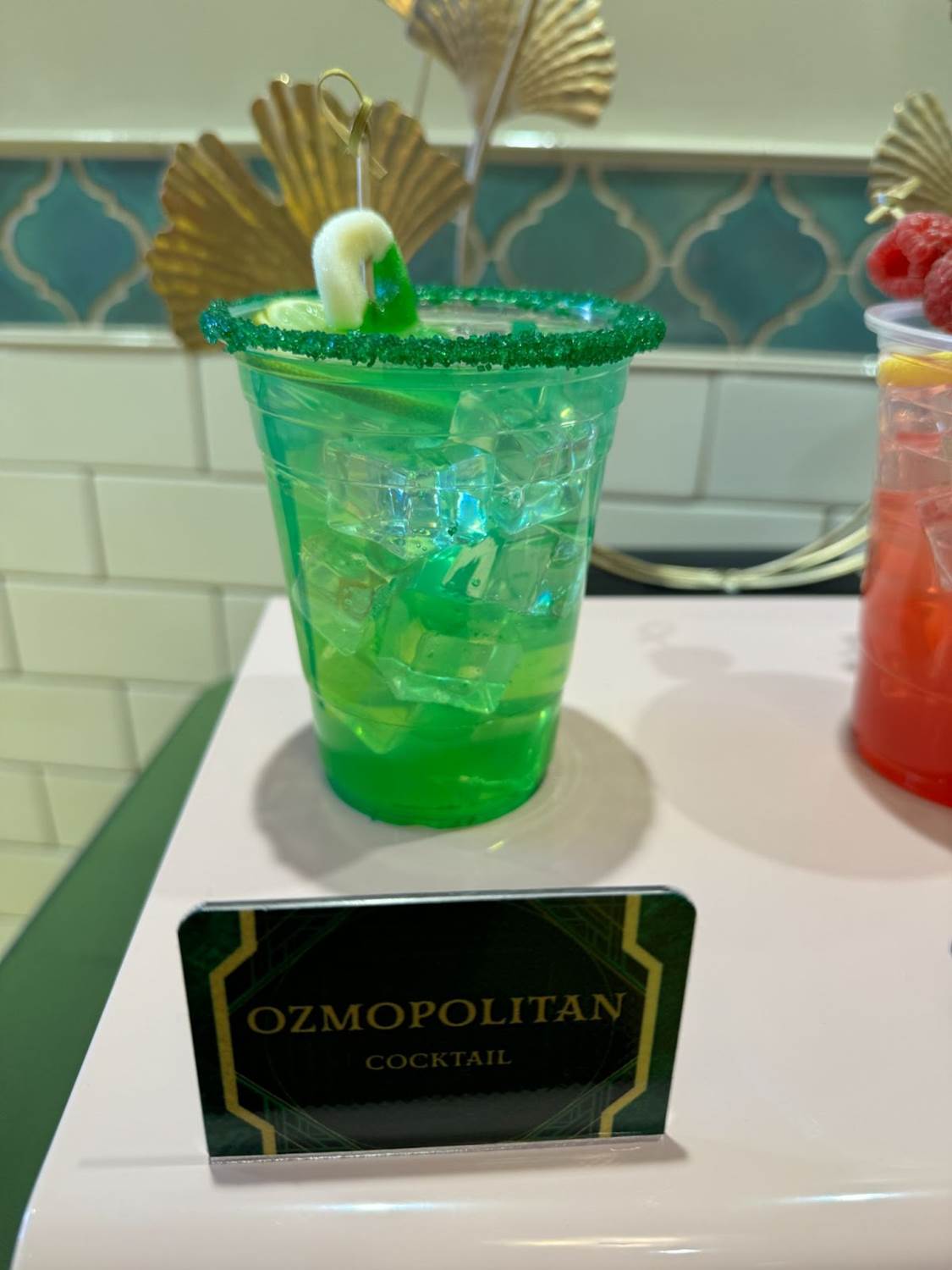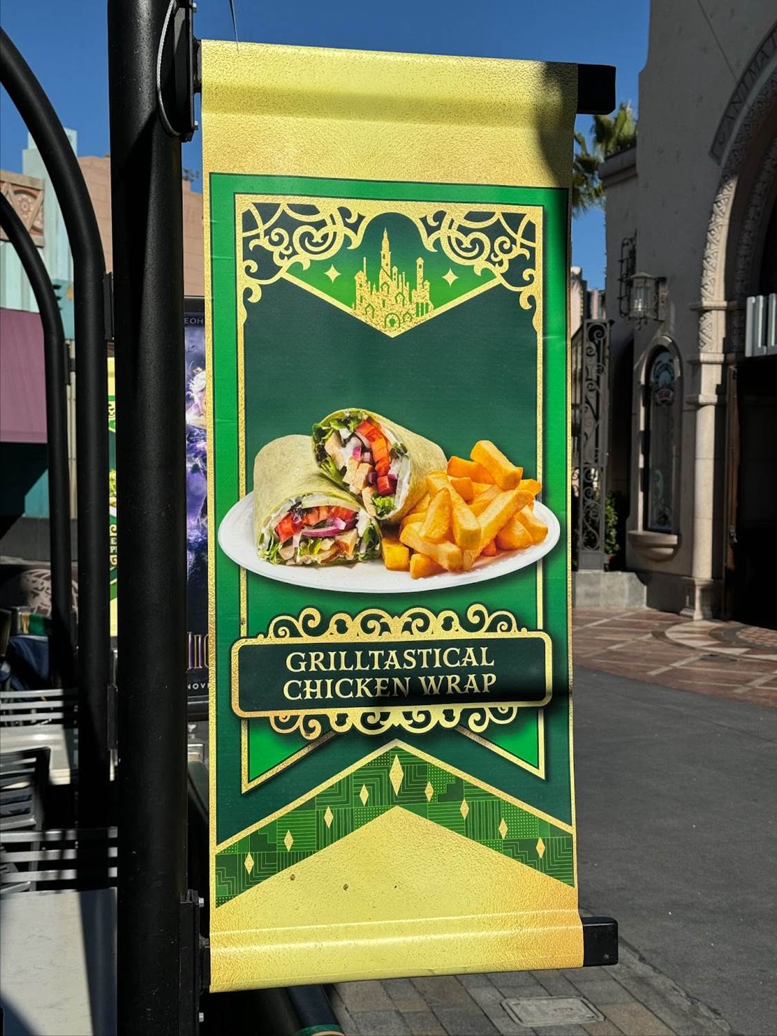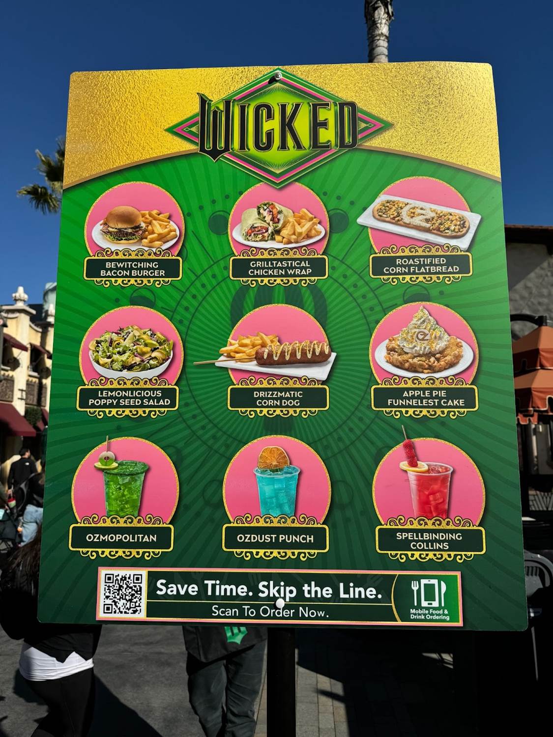 A special Wicked menu offers food items such as the Bewitching Bacon Burger, Grilltastical Chicken Wrap, Lemonlicious Poppy Seed Salad, Drizzmatic Corn Dog, Roastified Corn Flatbread and Apple Pie Funnelist Cake. There are also two different alcoholic beverages (the Ozmopolitan and Spellbinding Collins) and one non-alcoholic drink (Ozdust Punch) available at Hollywood & Dine.