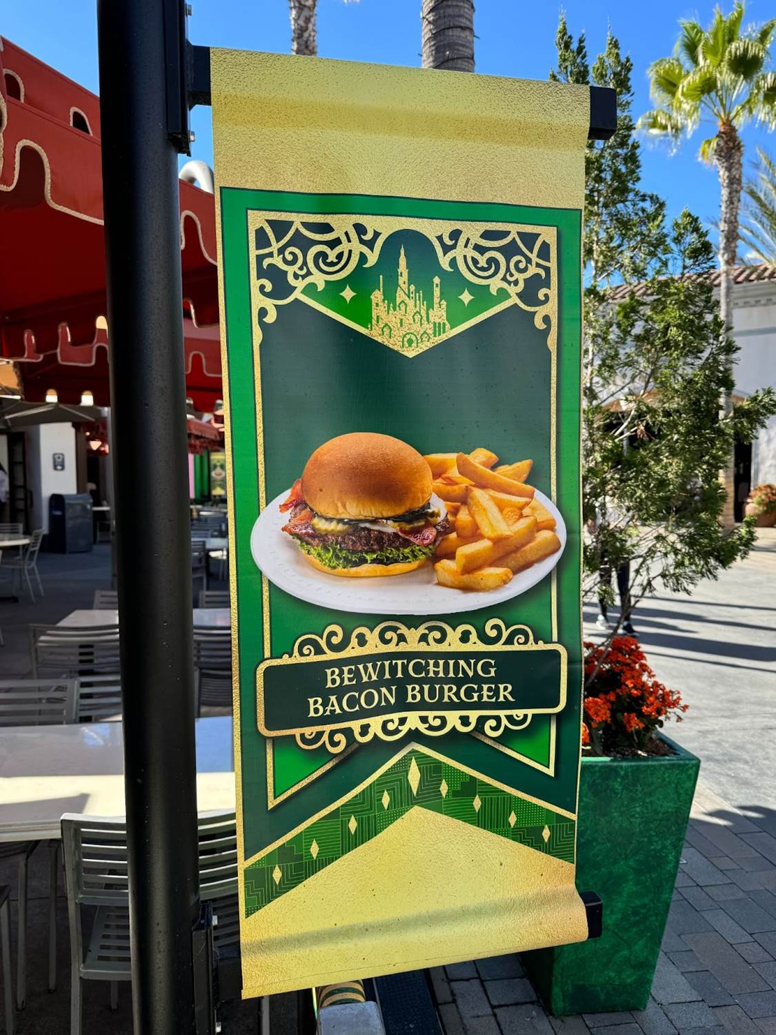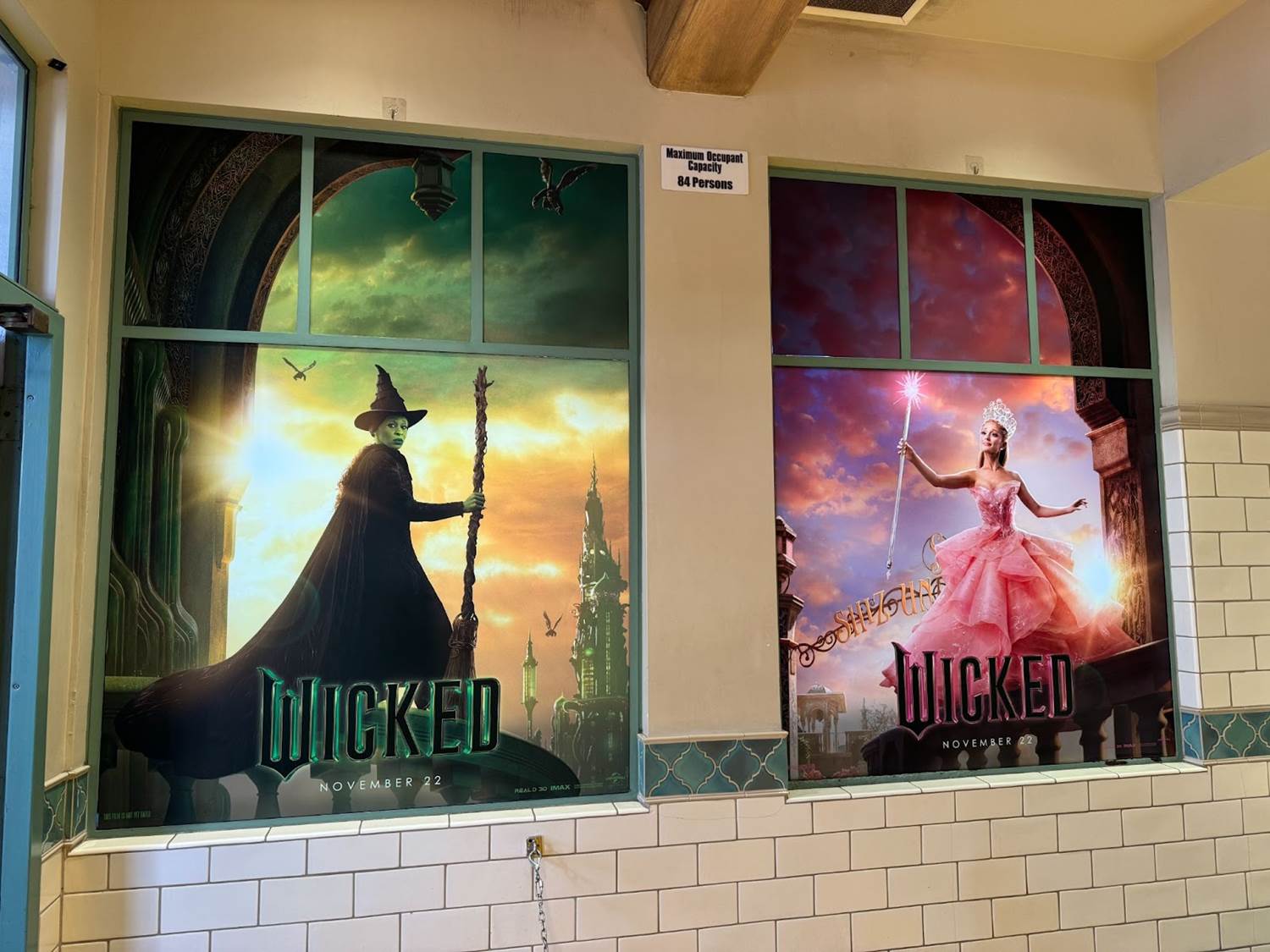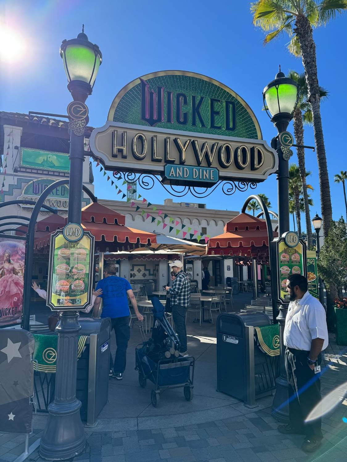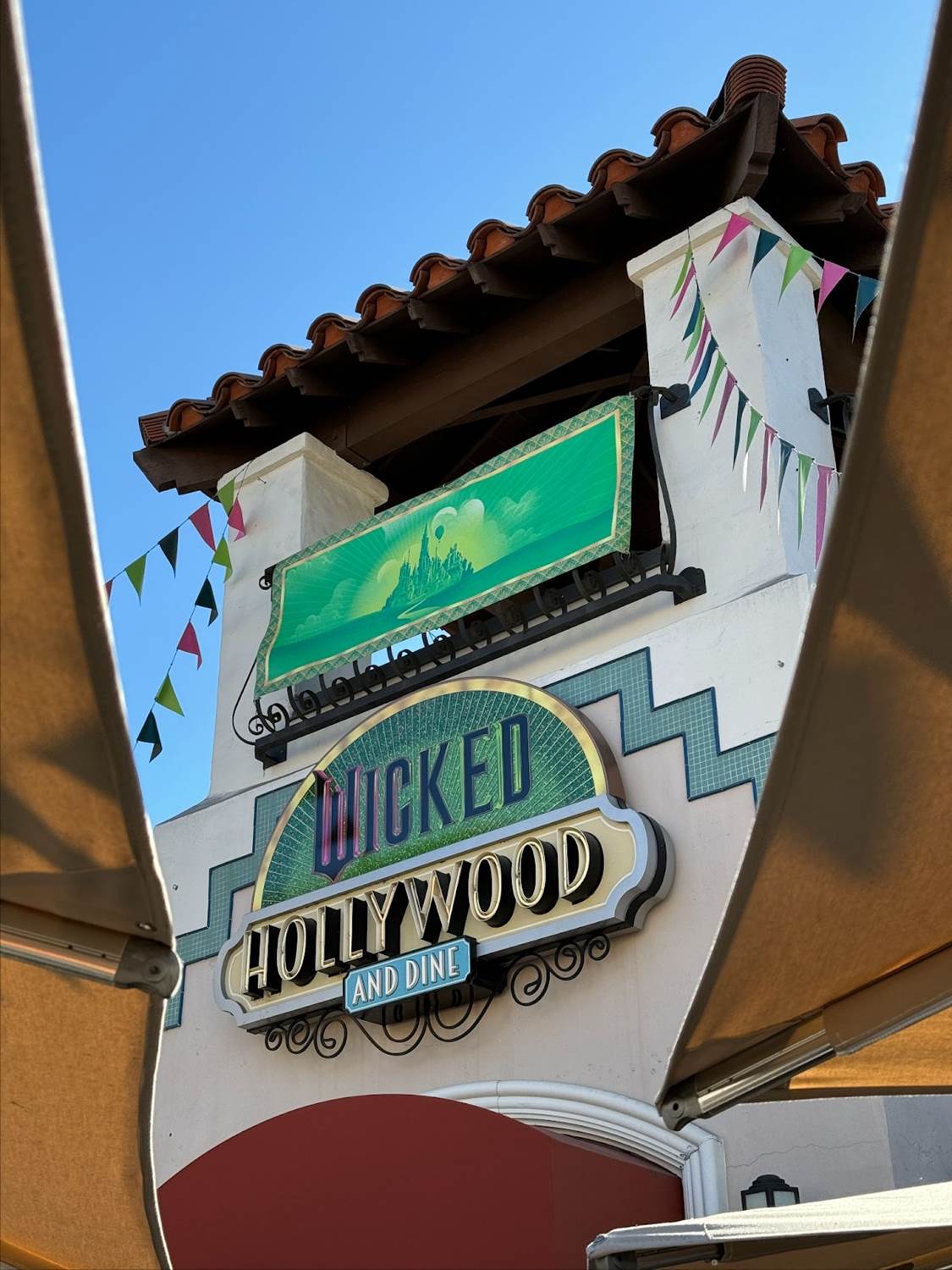 Inside Universal Studios Hollywood itself, the Hollywood & Dine counter-service restaurant is surrounded by Wicked banners, with even more decor themed to the movie in the location’s interior.