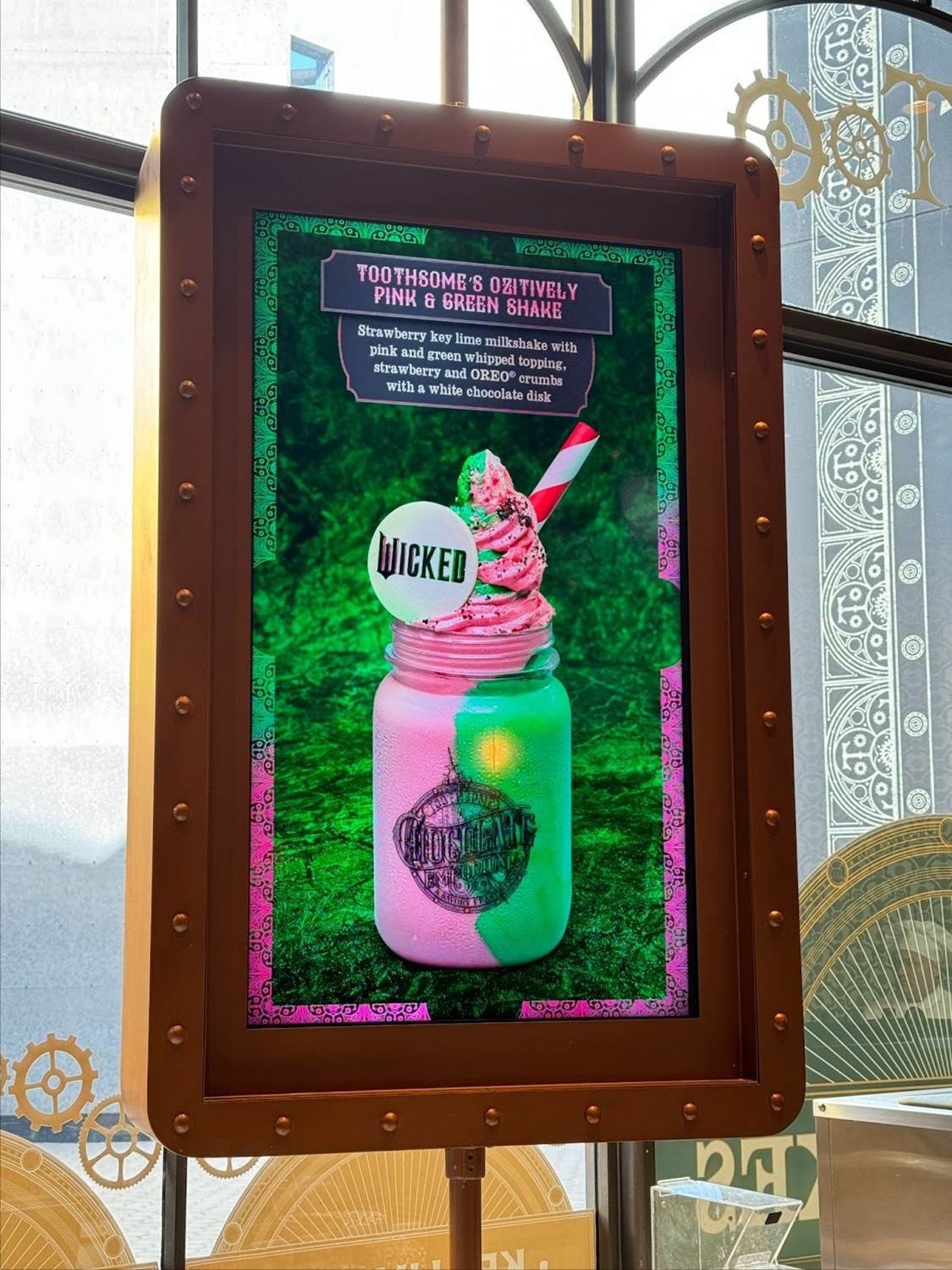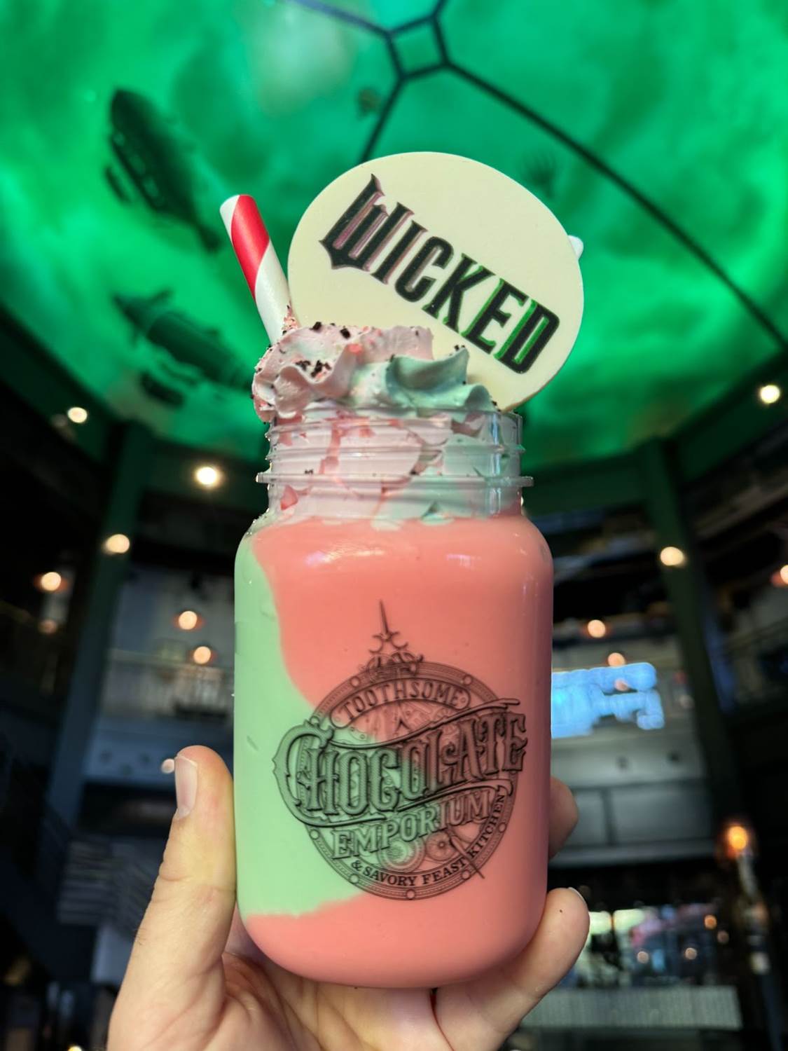 Across the way at Toothsome Chocolate Emporium & Savory Feast Kitchen, the restaurant is offering an “Ozitively Pink & Green Milkshake" flavored with strawberry and key lime, plus whipped topping, cookie crumbs, and a white-chocolate disk decorated with the Wicked logo.